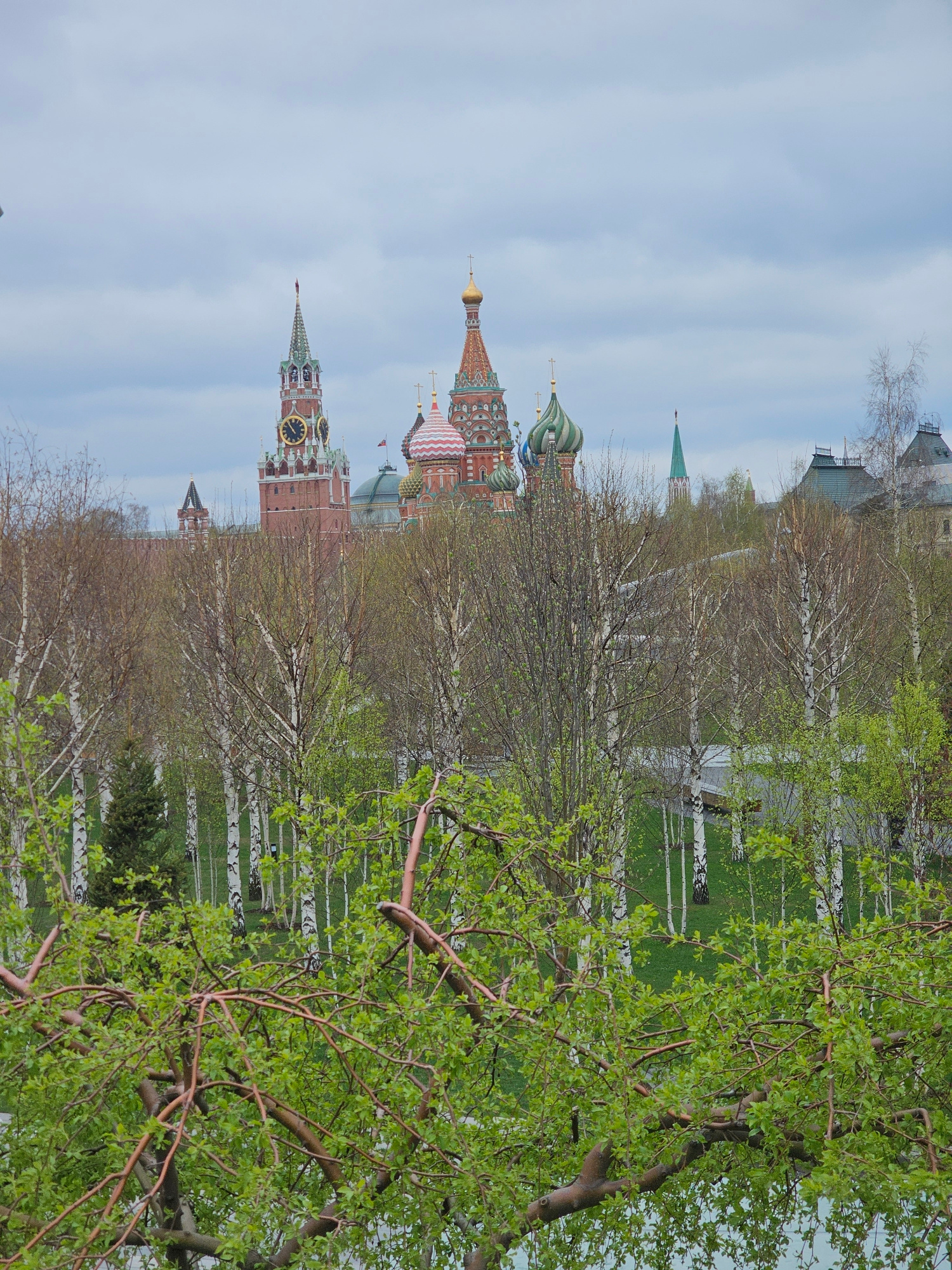 The image shows a view of the Moscow Kremlin, located in the city of Moscow, Russia. The Kremlin's red brick walls and several of its iconic towers and cathedrals with their distinctive domes are visi…read more