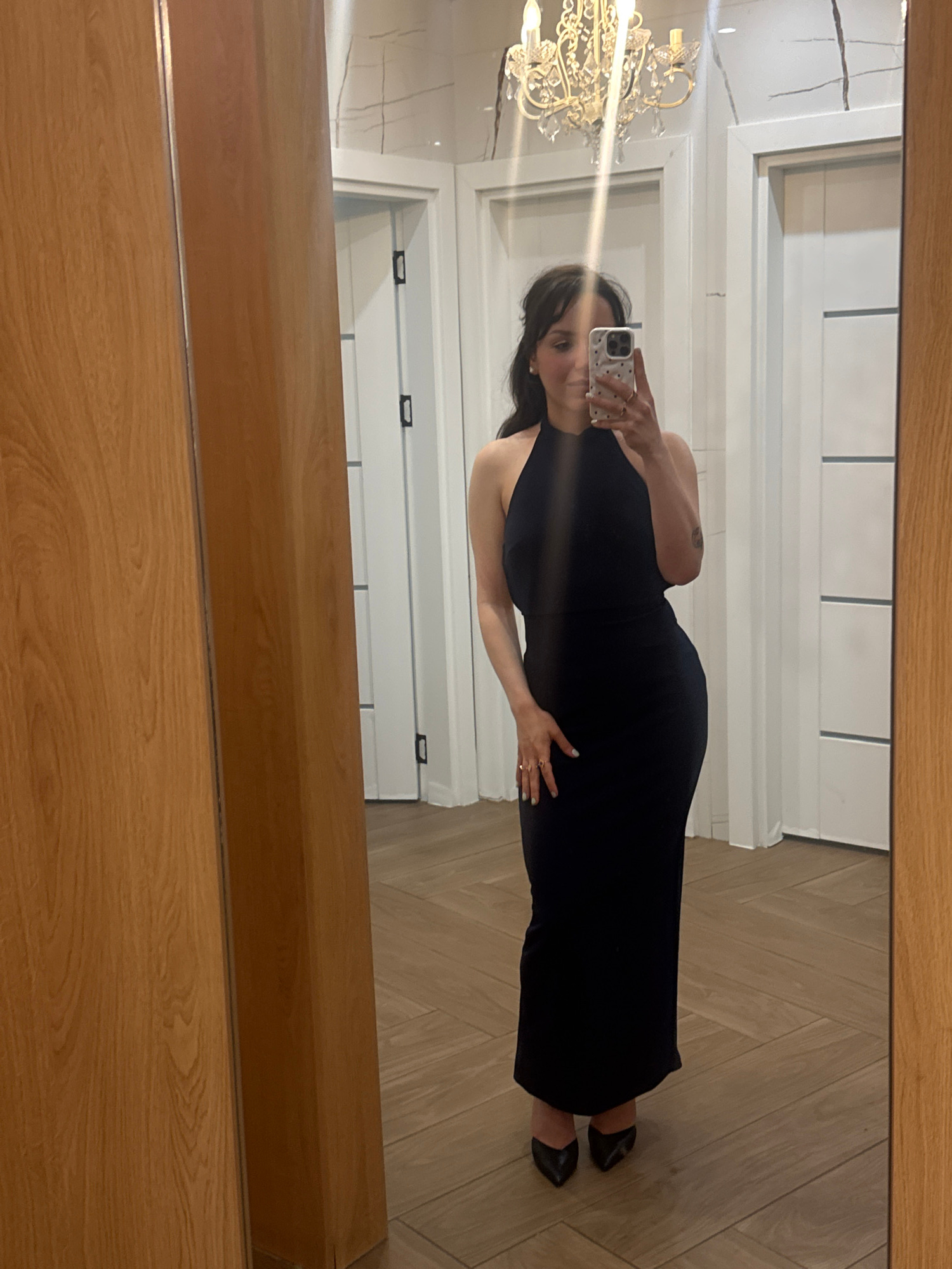 An indoor mirror selfie captures a woman posing in a well-lit room. She stands sideways to a large mirror with a thick, light-brown wooden frame, holding a white smartphone with a patterned case to ta…read more