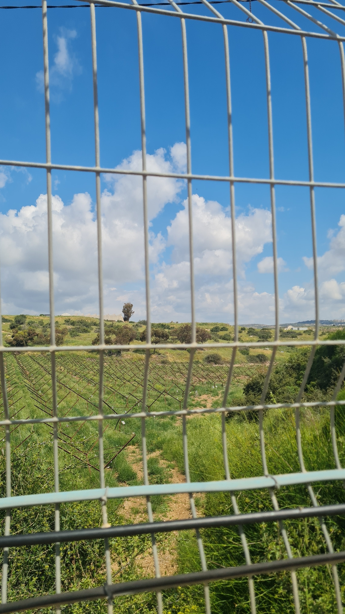 A landscape in the Lachish Regional Council, Israel, is viewed through a wire fence. The sky, filled with clouds, is visible on the left side of the frame through the fence. On the right, a field withβ¦read more