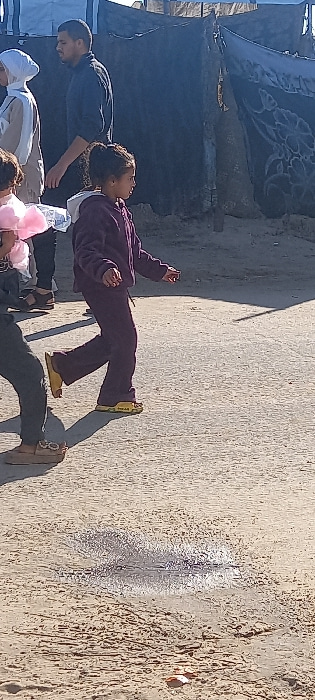 The image depicts an unpaved outdoor area in Khan Yunis, Palestinian Territory, under strong sunlight. In the foreground, a person's lower leg, clad in dark pants and light brown loafers, is visible o…read more