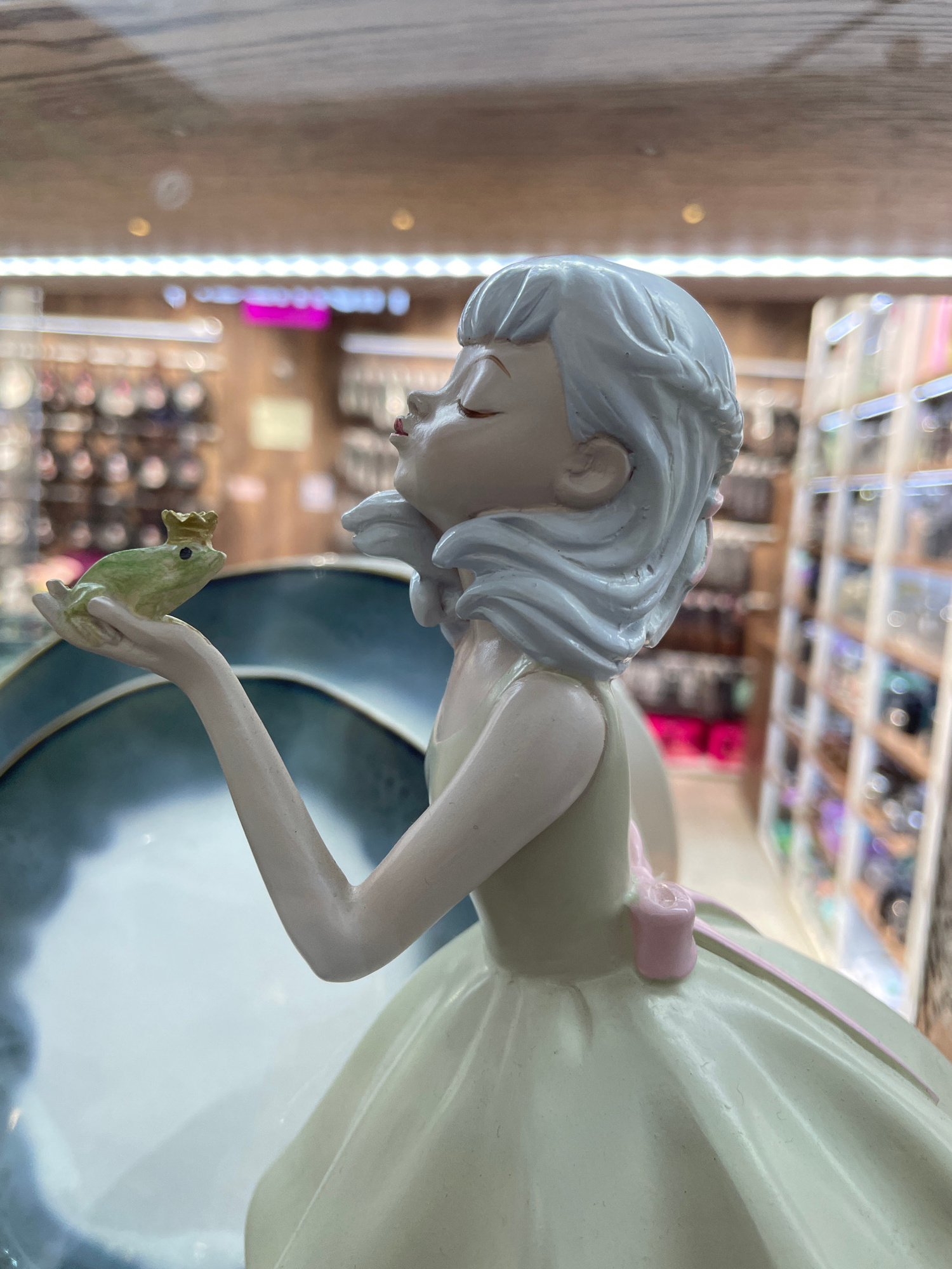 A porcelain figurine of a girl holding a frog is displayed in a glass cabinet. The girl has white hair and a pale yellow dress with a pink bow. She is looking down at the green frog she holds in her h…read more