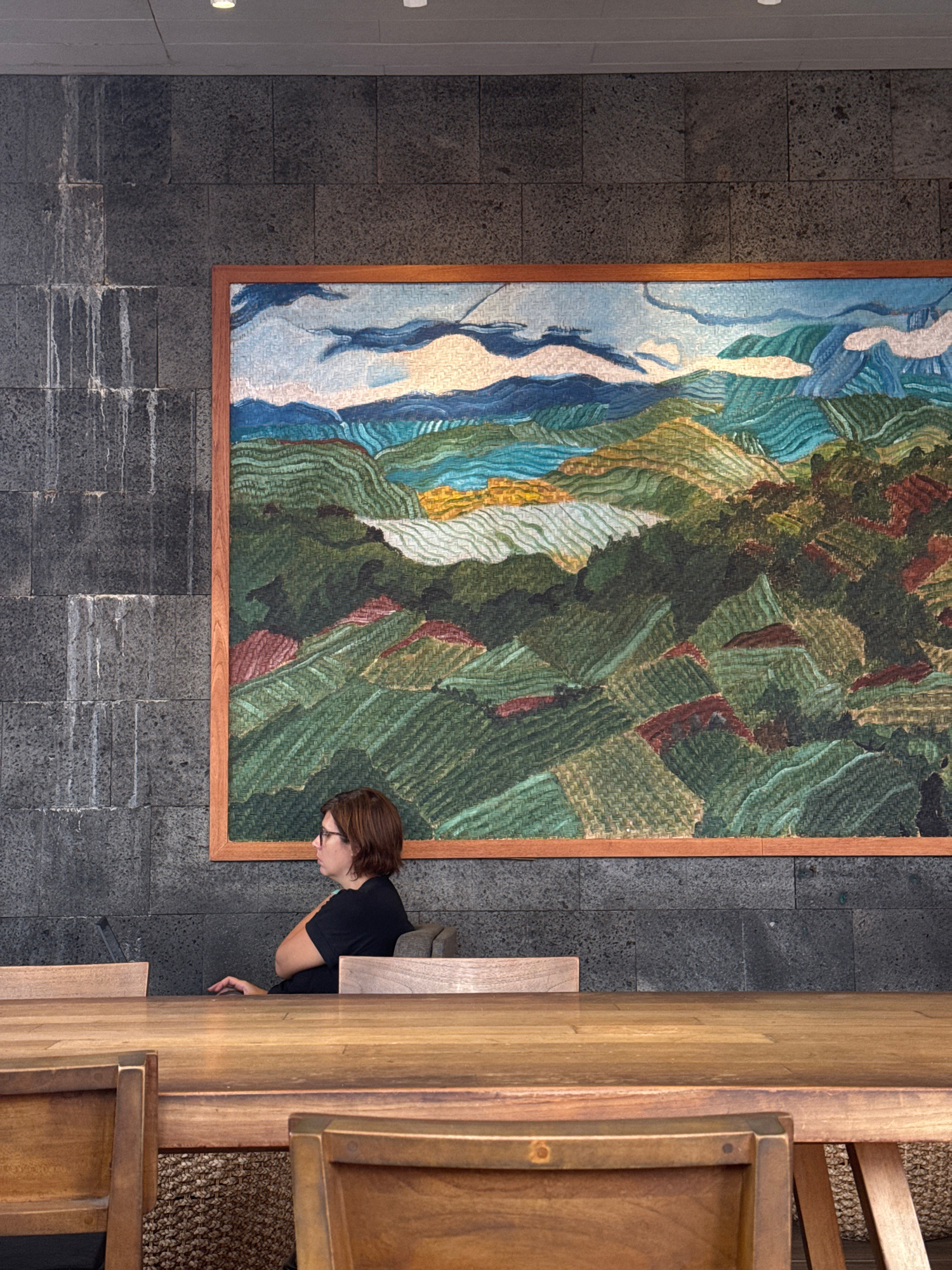 An overhead shot captures an interior scene, likely a hotel lobby or dining area in North Kuta, Indonesia. The dominant feature is a large, rectangular woven rug laid on a dark grey, textured tiled fl…read more