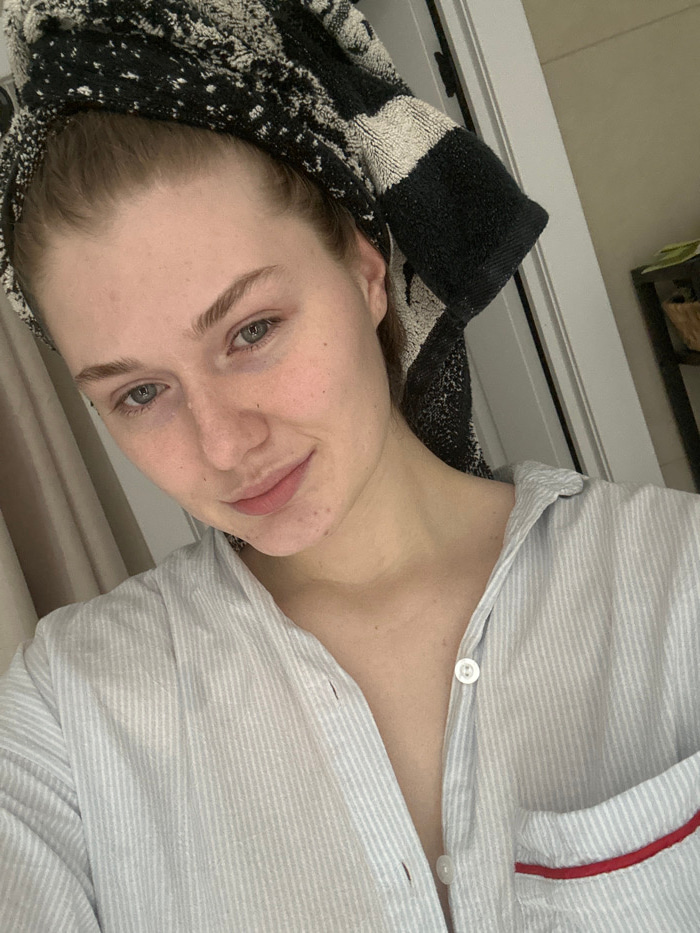 A woman with light skin and hair is lying down. She has a towel wrapped around her head and is wearing a striped pajama top with red piping. She looks at the camera with a slight smile. Her eyes are b…read more