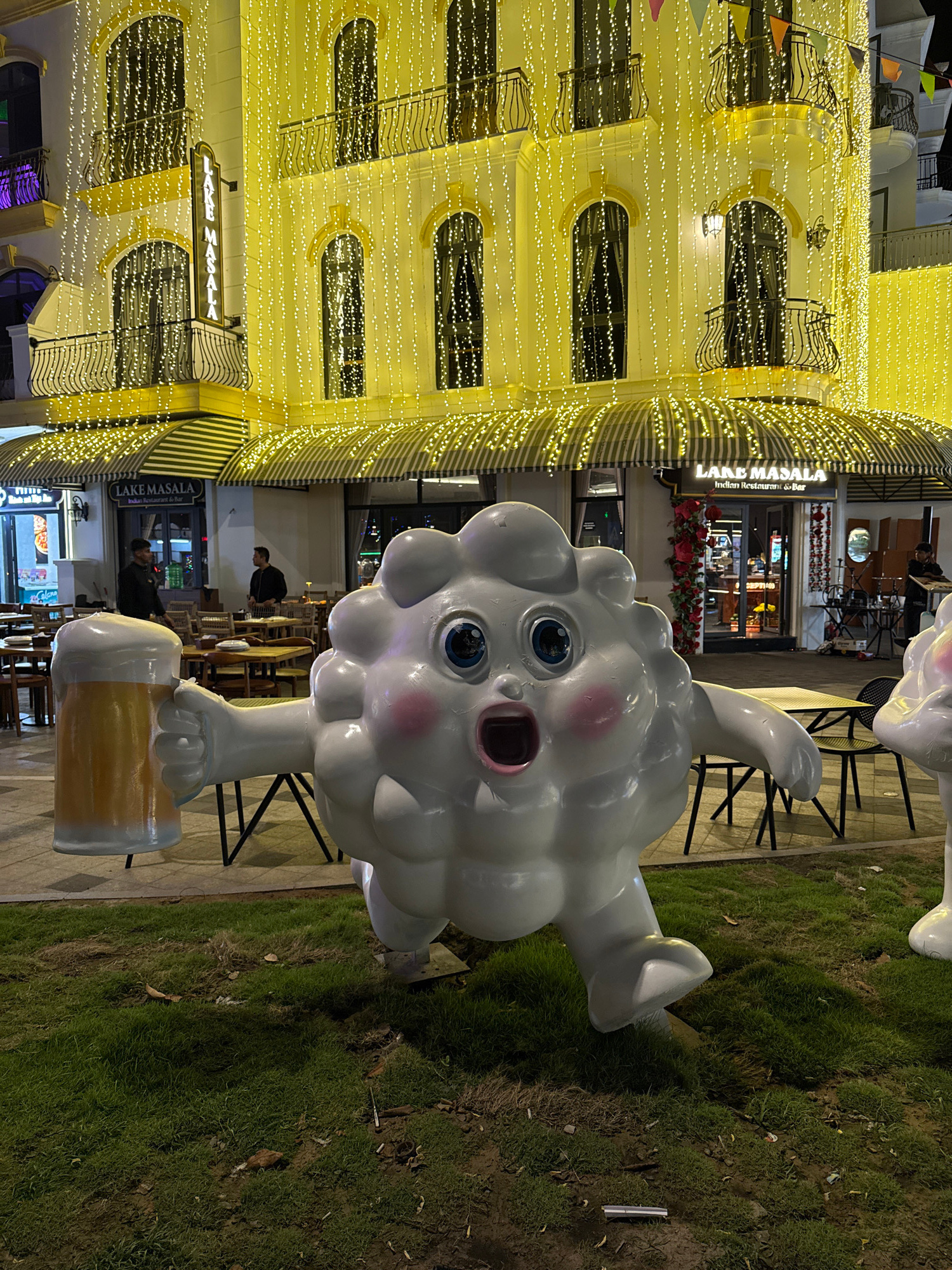 The image captures a vibrant night scene in Phú Quốc, Vietnam, illuminated by numerous warm-toned string lights. The central subject is a large, white, cartoonish figure resembling a cloud or fluffy a…read more