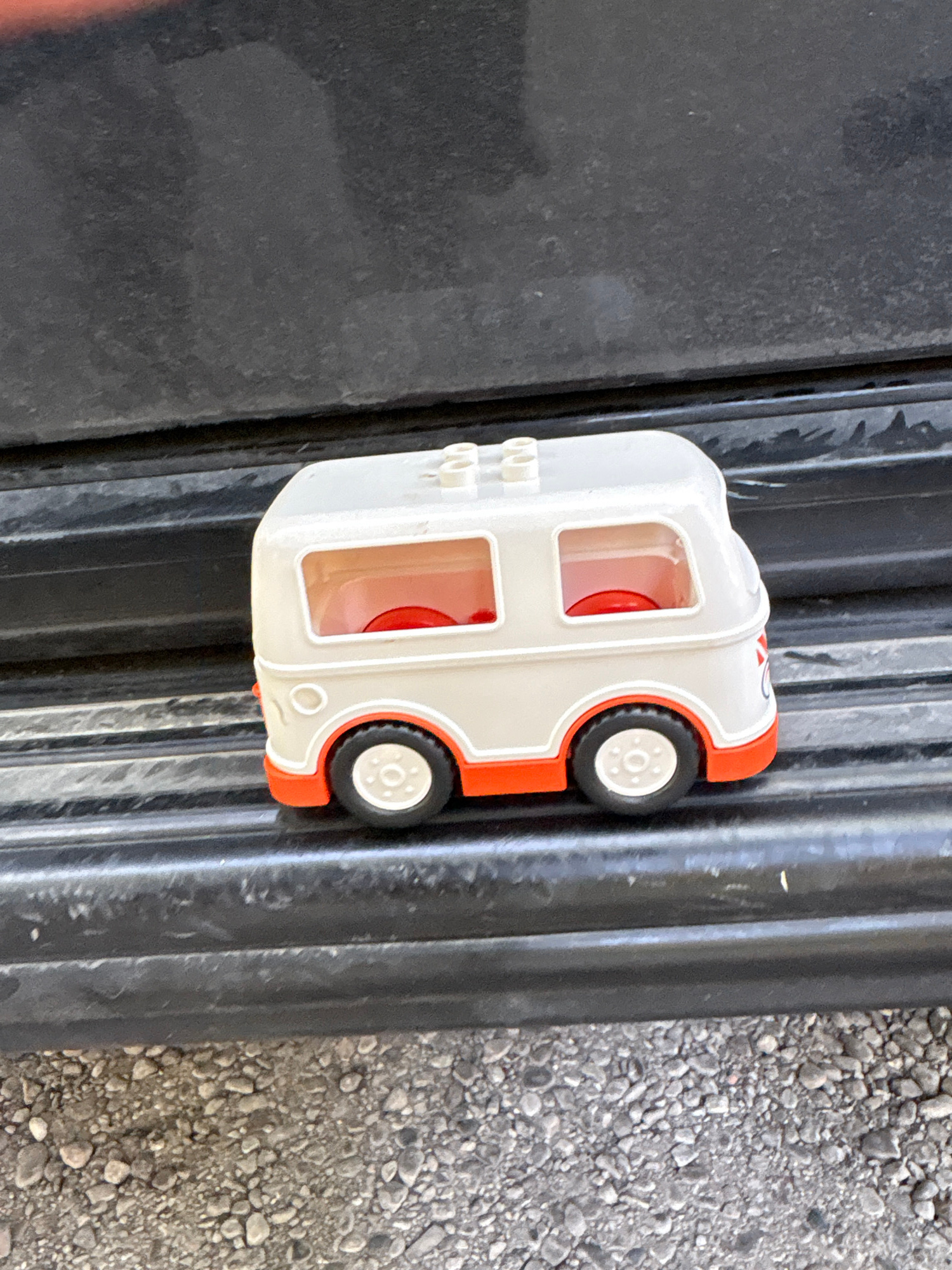 A child's toy camper van rests on a textured black surface with adjacent gray gravel. The toy is primarily white with orange accents and black wheels. The background includes black corrugated material…read more