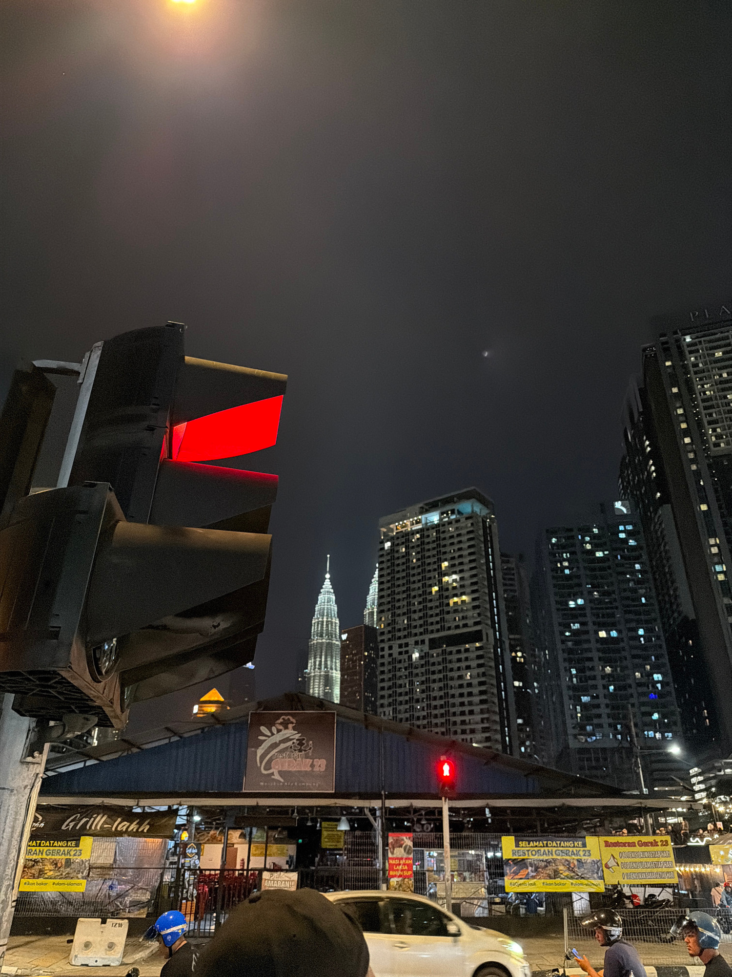The photo shows a night scene in Kuala Lumpur, Malaysia. In the background are illuminated skyscrapers, including the Petronas Twin Towers. A red traffic light is visible. In the foreground is a set o…read more
