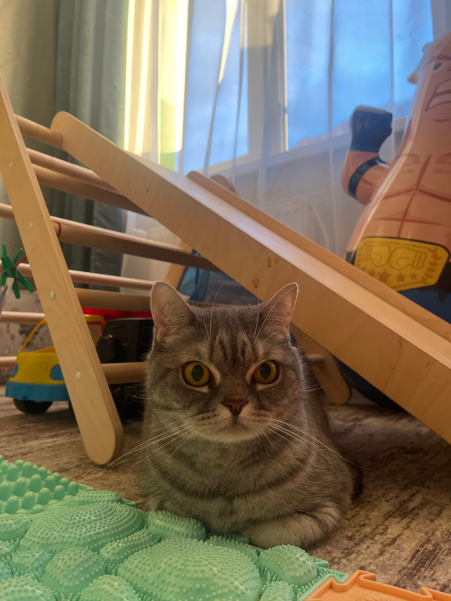 A gray tabby cat with distinctive yellow-green eyes looks directly at the viewer, its head tilted slightly. Its striped fur and prominent white whiskers are clearly visible. The cat appears to be rest…read more