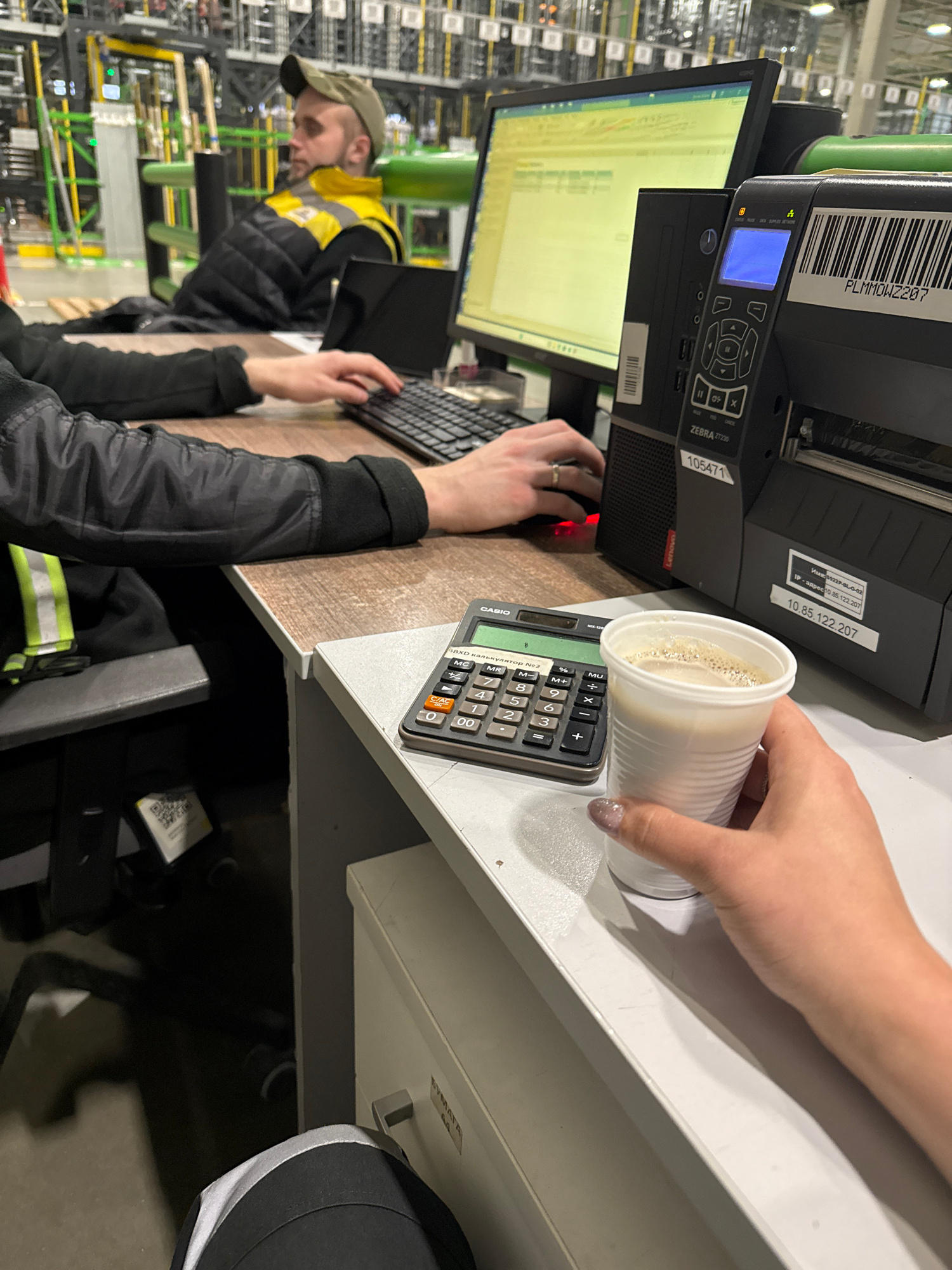 This image depicts an indoor scene at what appears to be a warehouse or industrial setting, possibly in Lupanovo, Russia. A person wearing a green cap, a yellow and black jacket, is seated at a desk o…read more