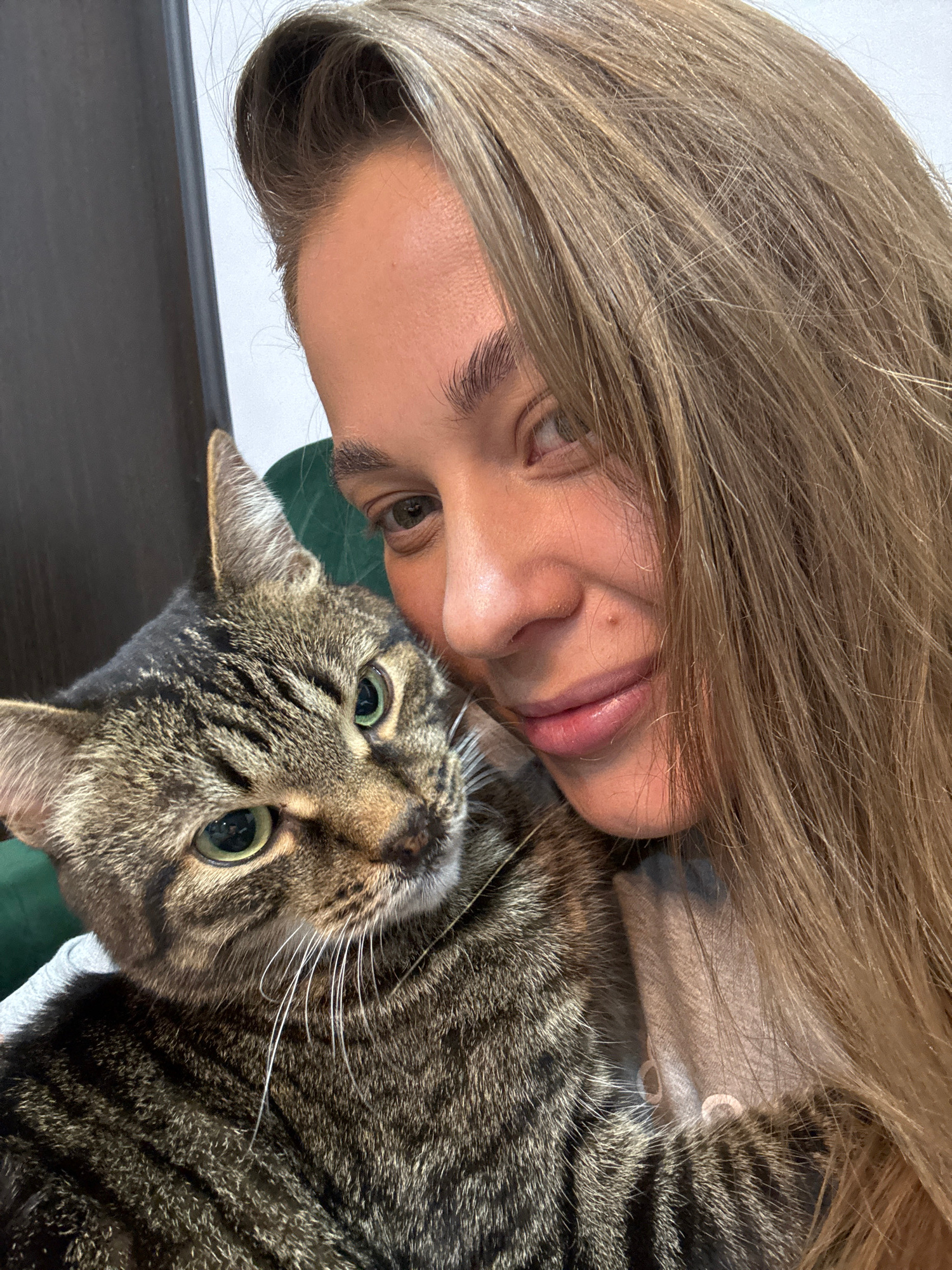 A woman with long, light brown hair is lying on her side, her face close to the camera. A tabby cat is nestled next to her, its face also close to the camera. The cat has green eyes and distinct tabby…read more