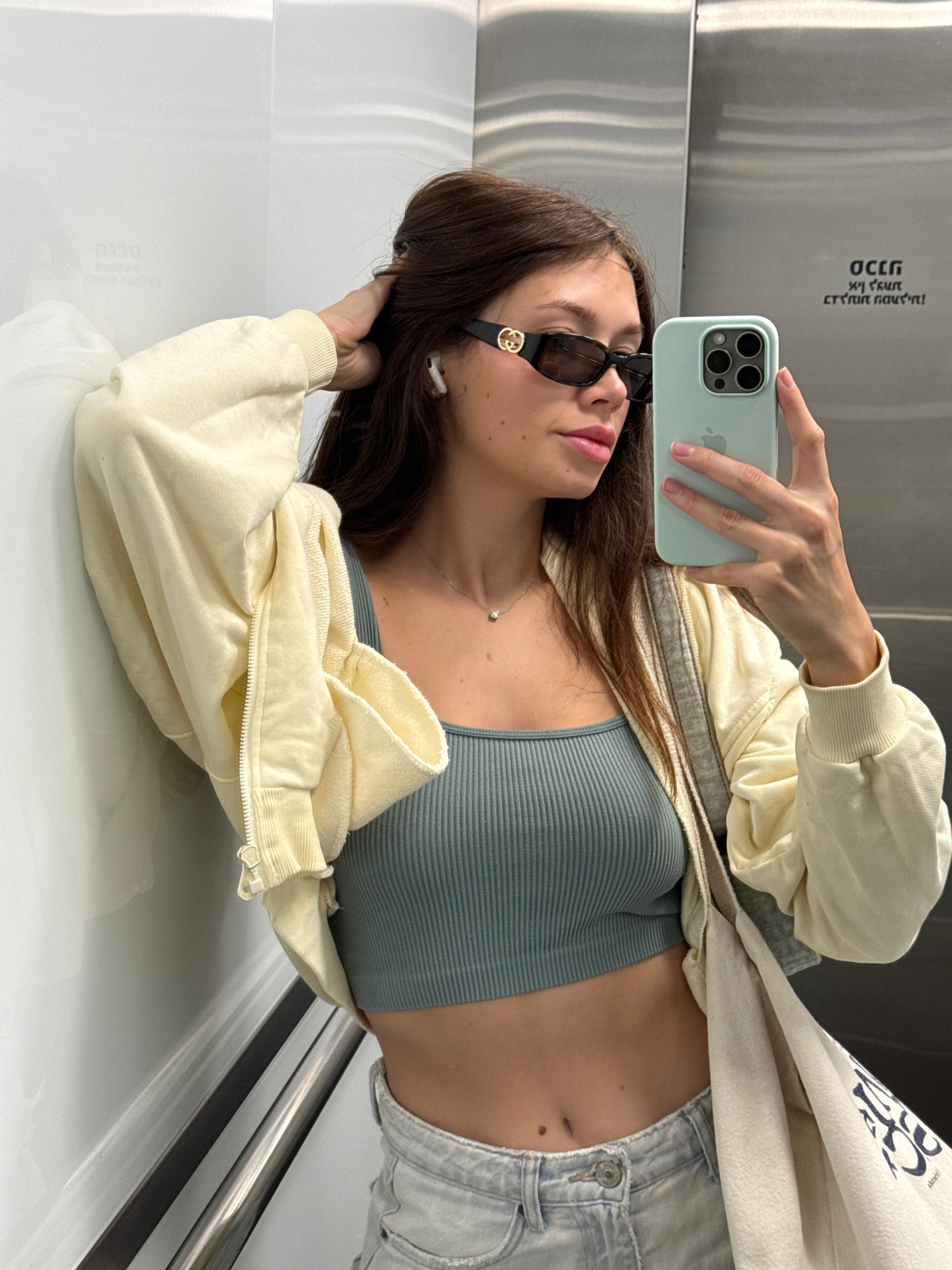 A woman with brown hair is taking a selfie with an iPhone. She is wearing sunglasses and a light-green top, a yellow jacket, and light-colored jeans. An earpiece is visible in her ear. The selfie appe…read more