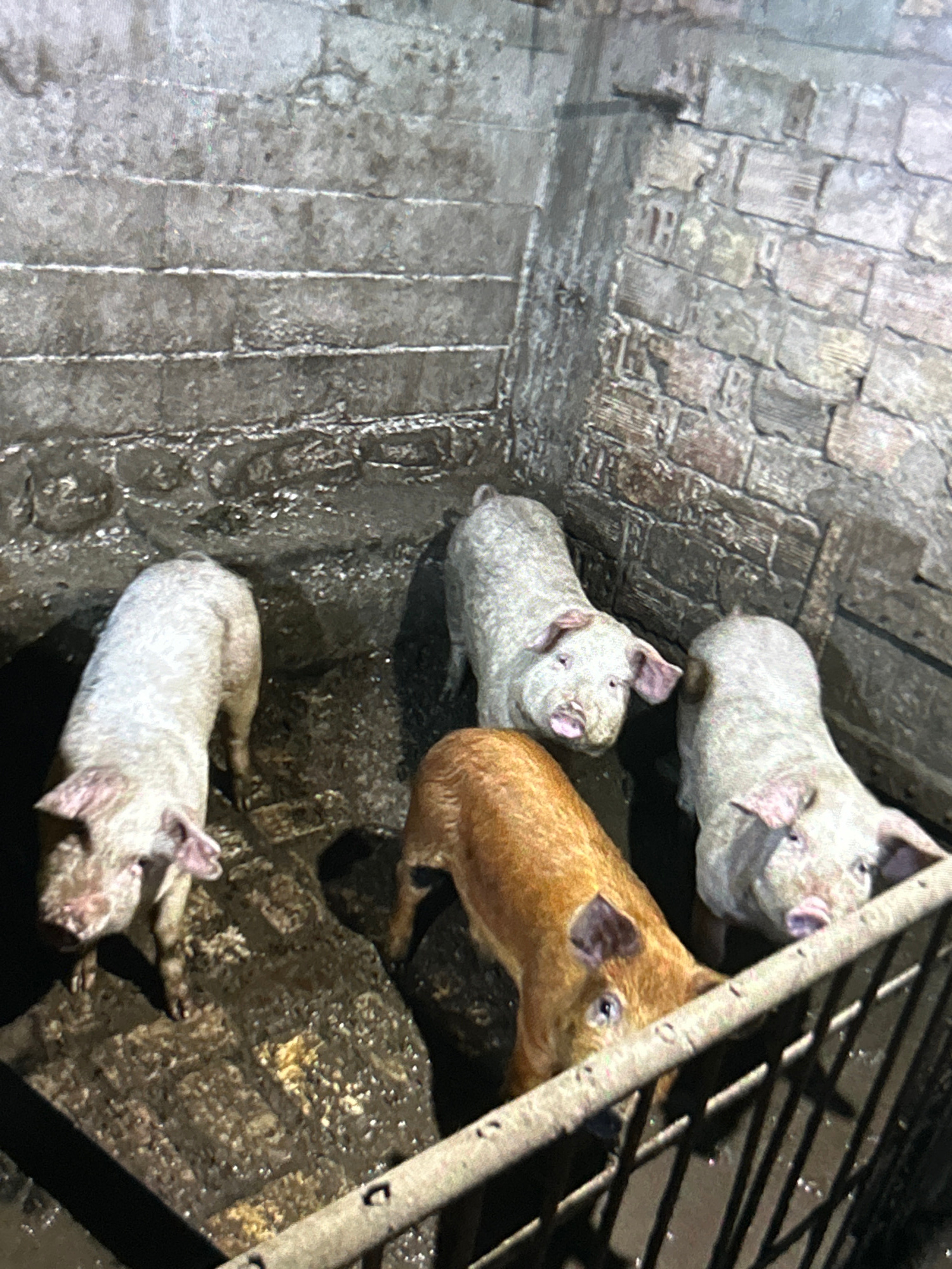 The image depicts a small group of young pigs in a confined, indoor space. There are three light-colored pigs and one reddish-brown pig. The floor appears to be made of concrete or a similar material…read more