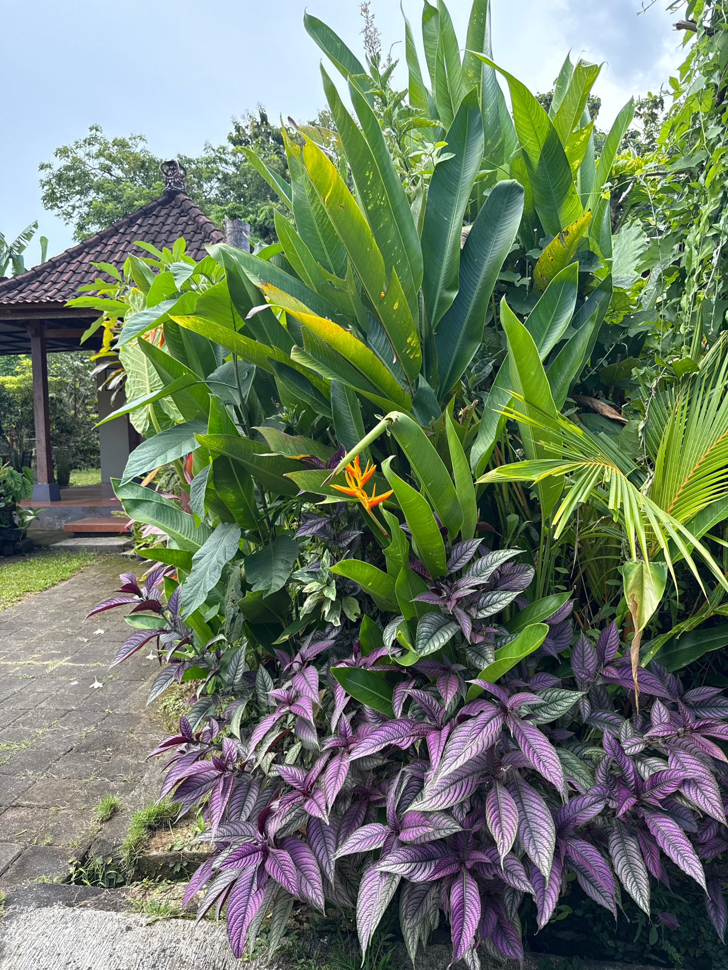 The image captures a vibrant garden scene in Kutuh, Indonesia. Lush greenery dominates, featuring large green leaves of what appears to be Heliconia plants, interspersed with purple-veined Persian Shi…read more