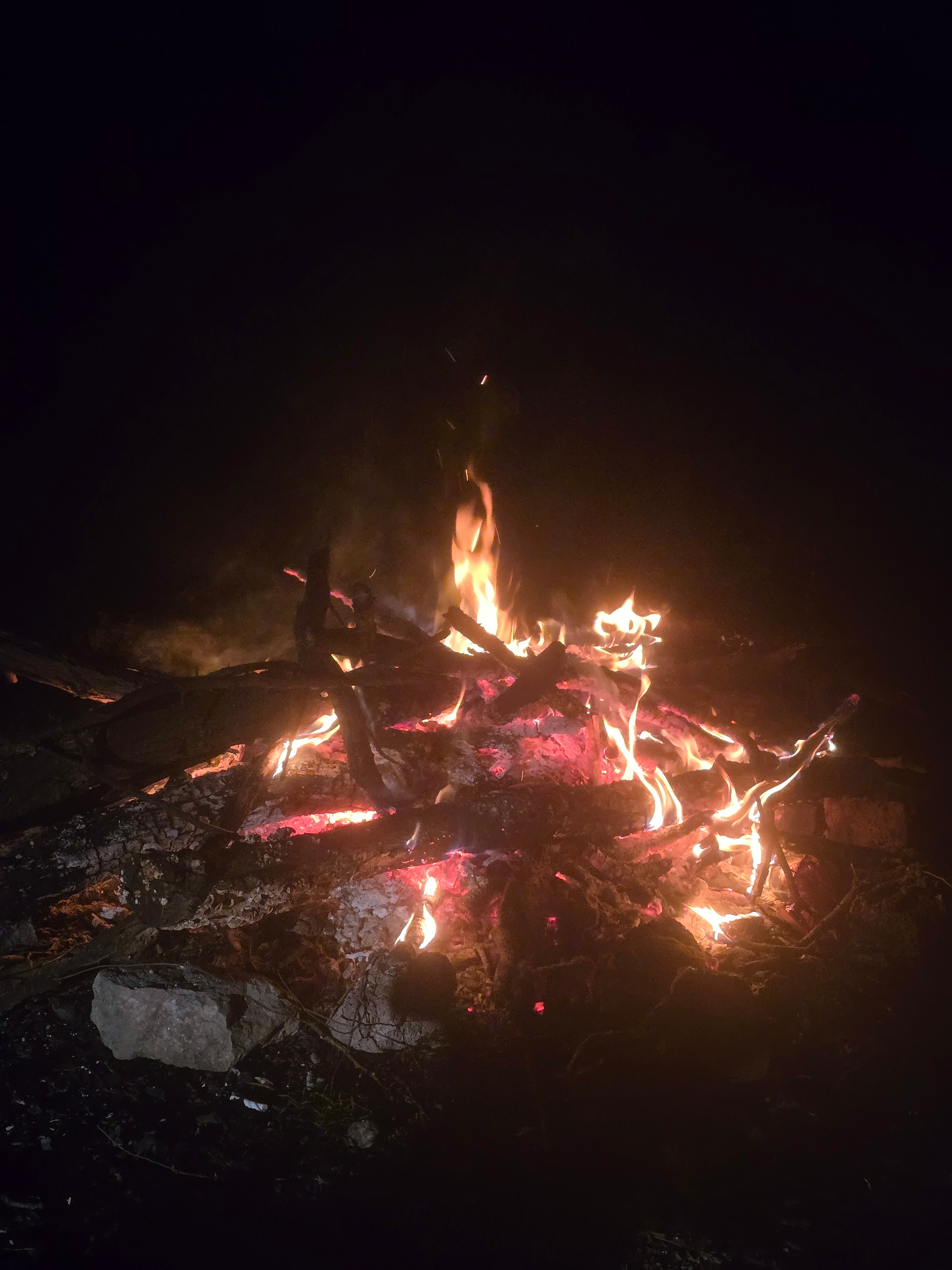 The image depicts a bonfire at night. The fire consists of burning wood and logs, with flames prominently visible. Embers and smoke are rising from the fire. The background is dark and suggests an out…read more