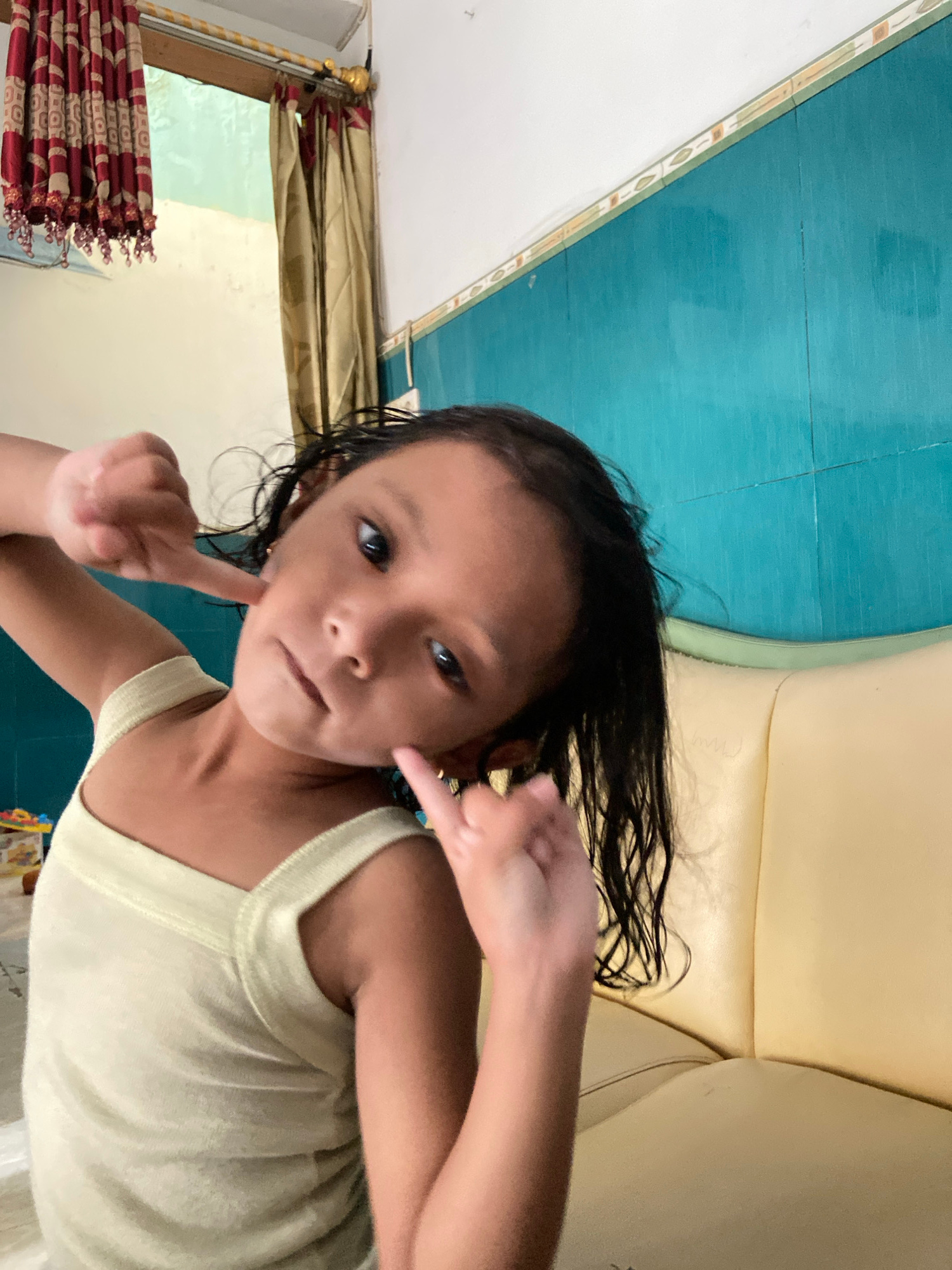 A young, Southeast Asian girl in Gelam, Indonesia is the primary subject. She is wearing a light yellow tank top and has wet, dark hair. The girl is making a playful gesture with her hands, touching h…read more