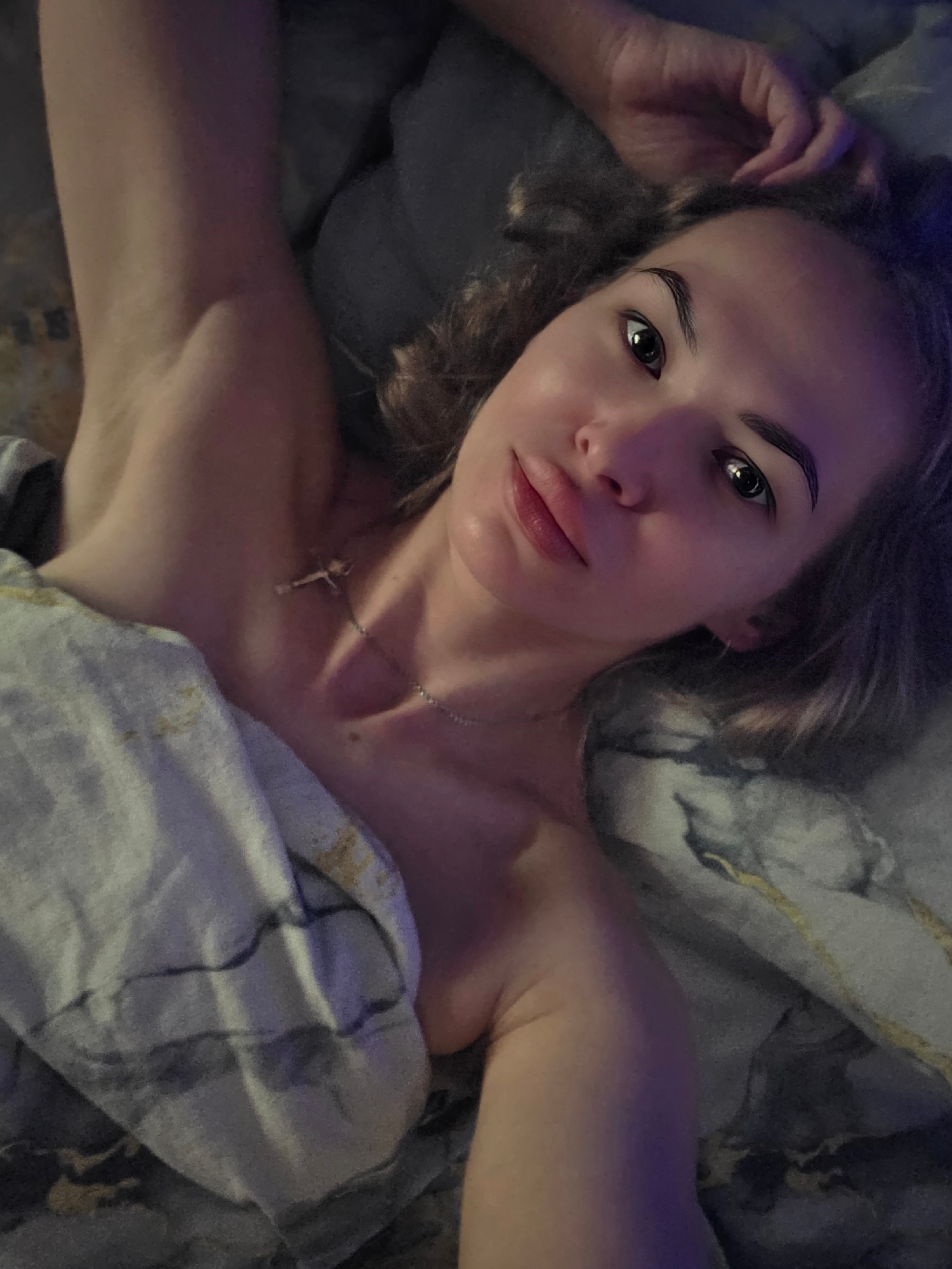 A woman lies in bed under a patterned blanket, looking directly at the camera. She has light skin, dark eyes, and short, wavy hair. She is wearing a delicate necklace with a cross pendant. Her right h…read more