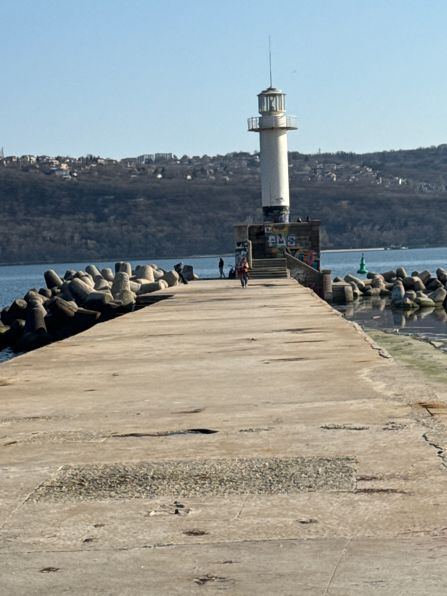 The image depicts a lighthouse in Varna, Bulgaria, situated along a concrete pier. The lighthouse, painted white with black accents, stands prominently against a backdrop of a hillside densely populat…read more
