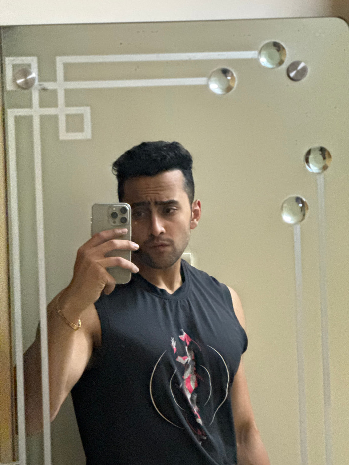 A man takes a selfie in a mirror. He holds his phone with his right hand, showing off a gold bracelet. He wears a black t-shirt with a circular design featuring red and white accents. The mirror has a…read more