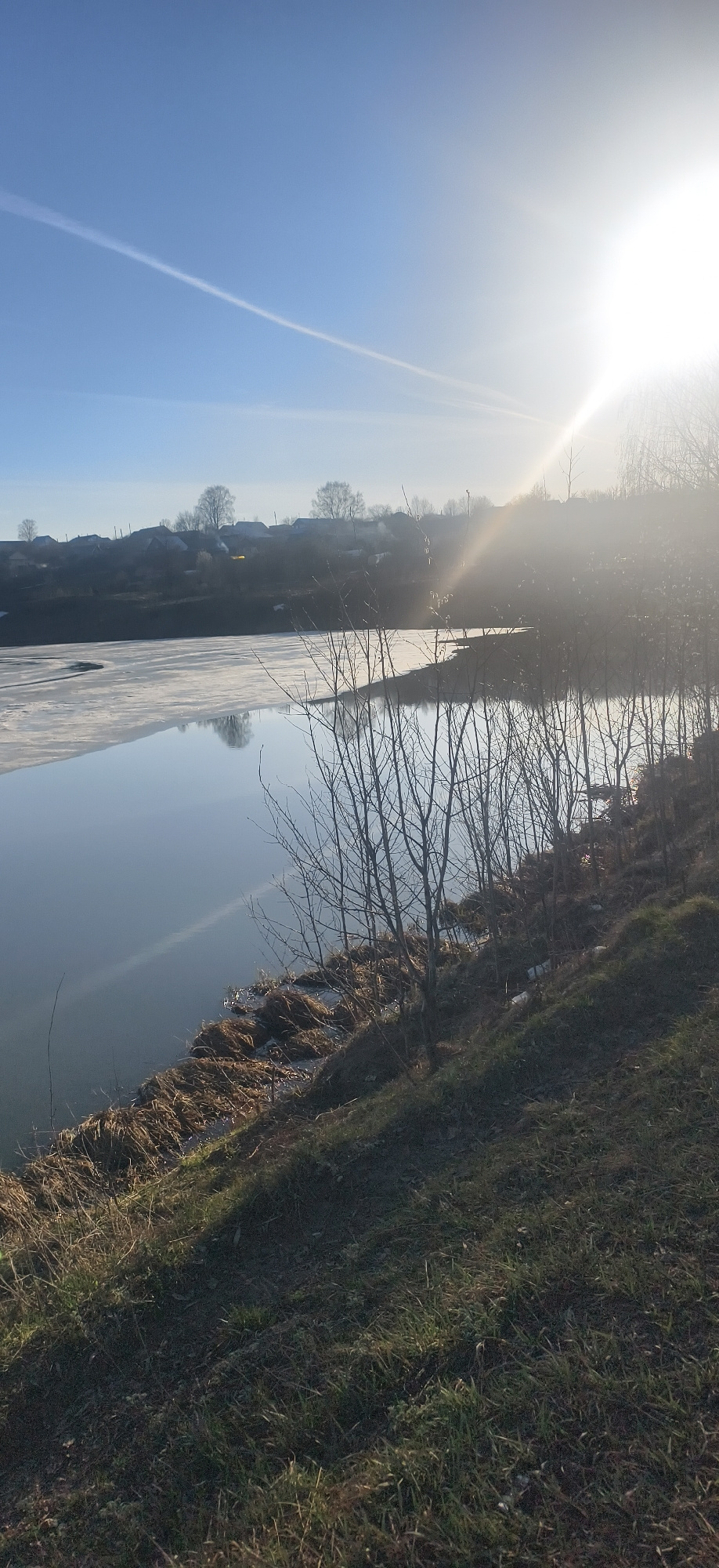 This landscape photograph presents a serene view of a partially frozen body of water in Фоки, Russia, bathed in the bright light of a low-hanging sun. The scene likely depicts late winter or early spr…read more