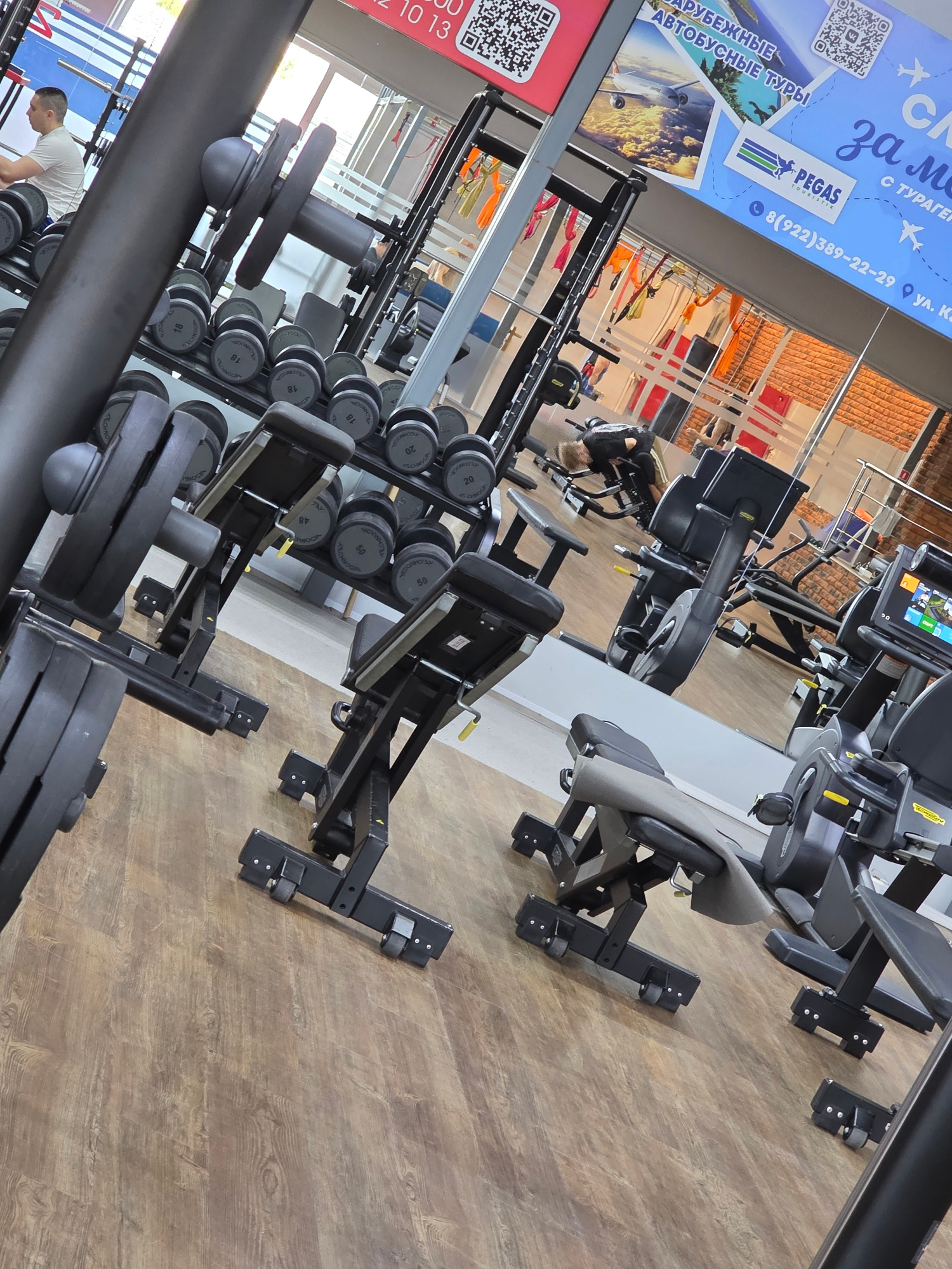 The image shows a gym interior with various exercise equipment. A weight rack with dumbbells is visible in the foreground, along with a leg press machine. Further in the background, there is a seated…read more