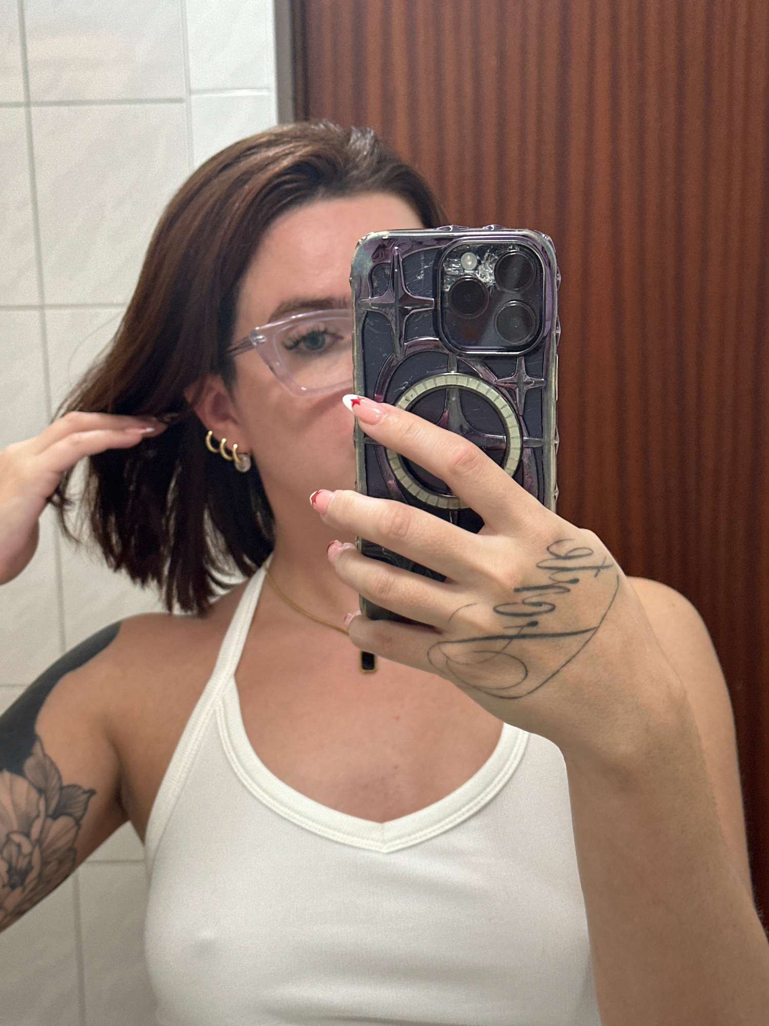 A woman takes a selfie in a bathroom. She is holding a phone in her right hand, which is partially obscuring her face. The phone case is dark with a magnetic ring on the back. Her nails are painted wi…read more