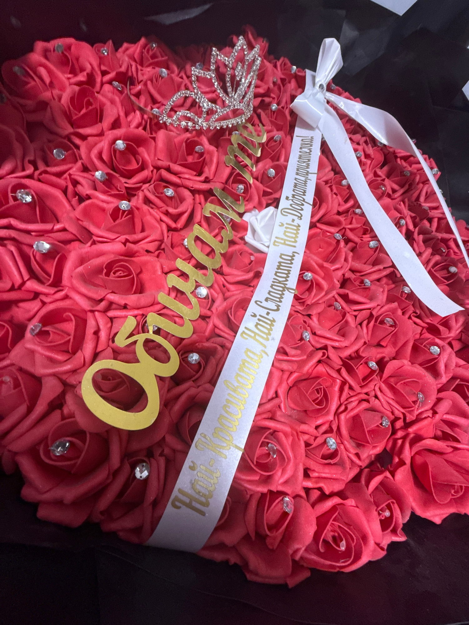 The image shows a bouquet of red roses, likely artificial, densely packed together in a circular or heart-shaped arrangement. Small, clear gemstones are interspersed among the roses. A white ribbon is…read more