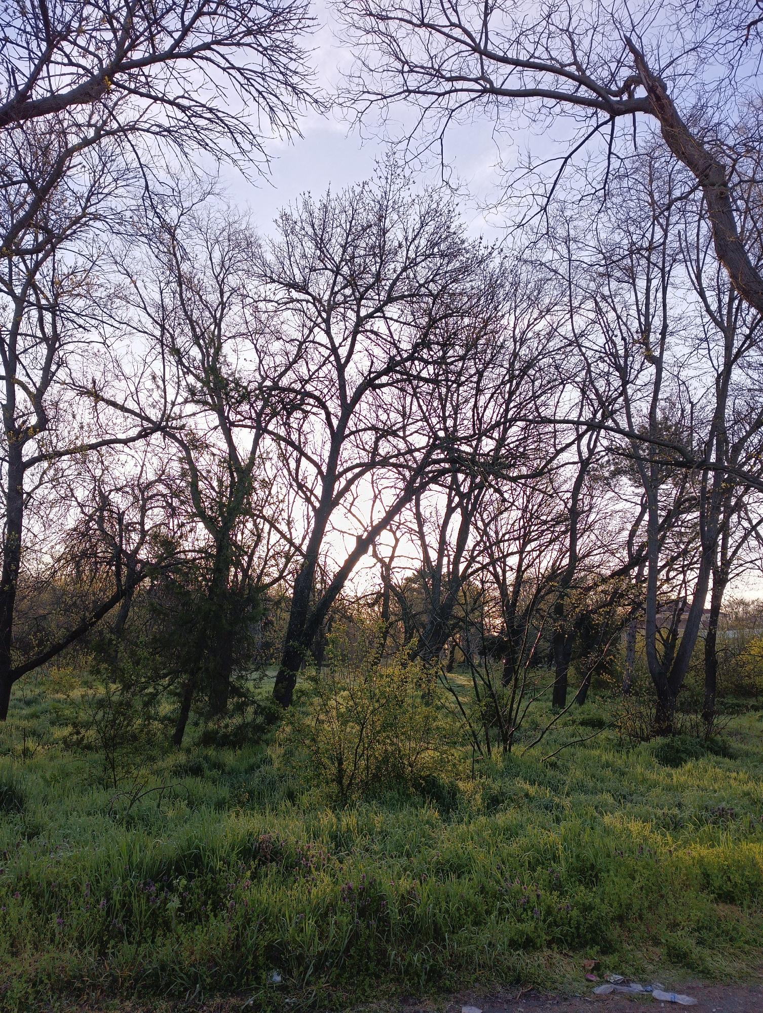The image presents a serene, wooded landscape, likely a forest edge or park in Karnobat, Bulgaria, captured during either sunrise or sunset. The sky, visible through the intricate network of bare tree…read more