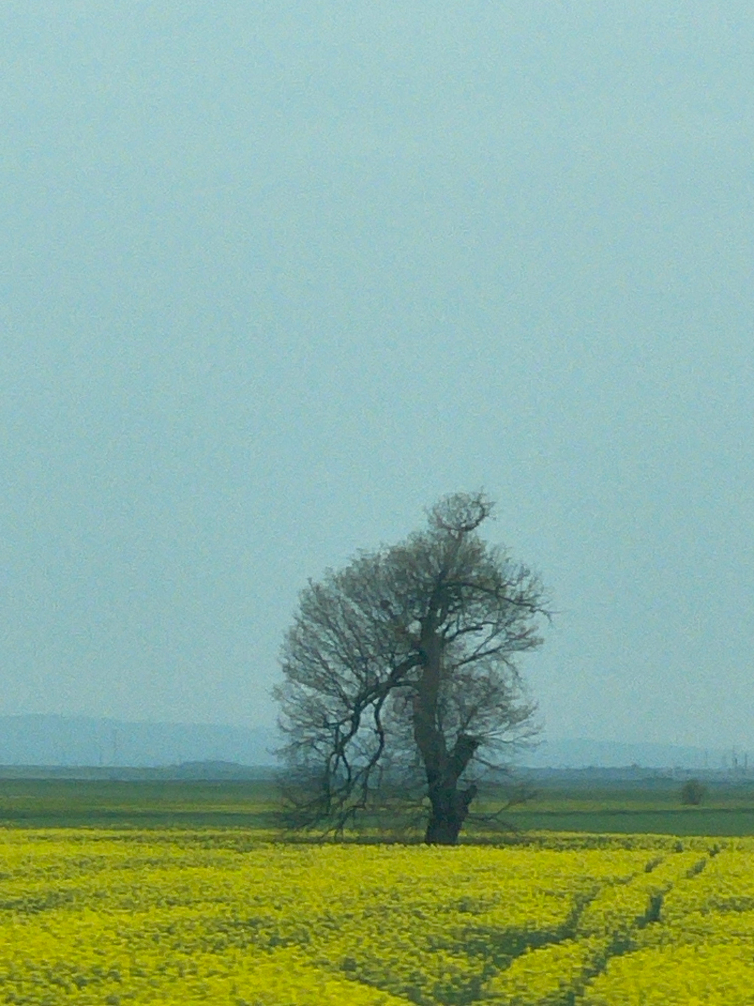 The image shows a landscape, seemingly in the vicinity of Benkovski, Bulgaria. A bare, deciduous tree stands between a field of yellow flowers (possibly rapeseed or mustard) and a light blue sky. Theβ¦read more