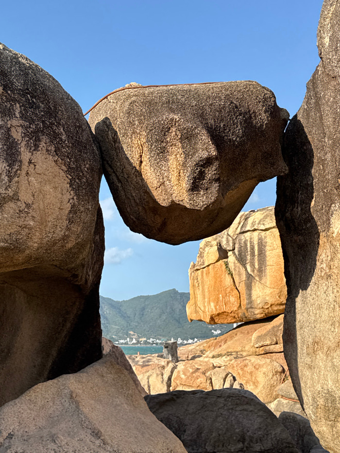 The image depicts a natural coastal rock formation at Hon Chong Promontory in Nha Trang, Vietnam, under a clear blue sky. The foreground and midground are dominated by massive, irregularly shaped gran…read more