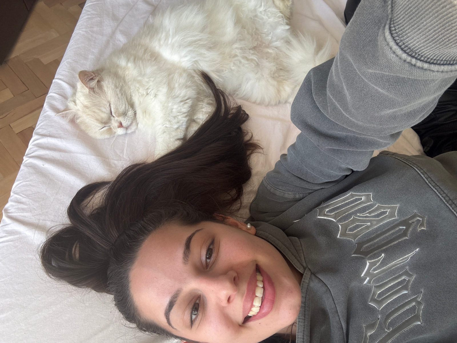 The image presents a relaxed indoor scene featuring a young woman and a white cat lying side-by-side on a white bed. The woman is positioned in the foreground, taking a selfie, and is looking up at th…read more