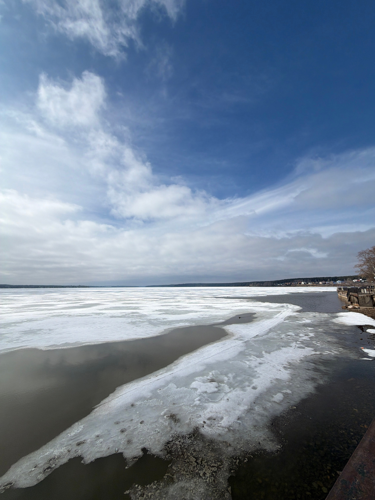 The image shows a view of the Votkinsk Reservoir in Votkinsk, Russia. The sky is blue with scattered clouds. The reservoir is partially frozen with ice along the shore. Along the top of the frame, bui…read more