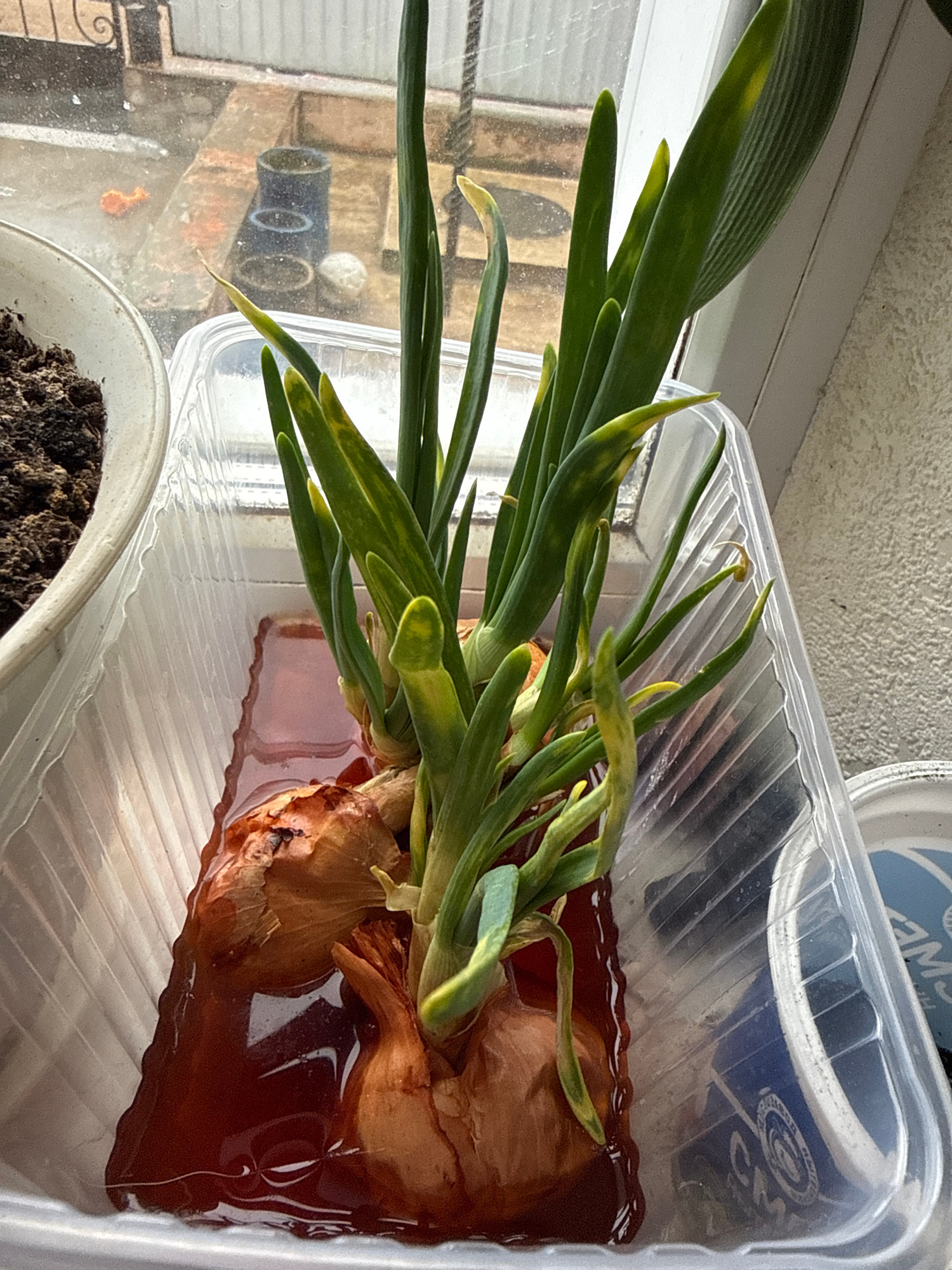 The image captures an indoor scene, likely near a window in Chaikovsky, Russia, where plants are being cultivated. The central subject is a clear plastic container holding two brown onion bulbs partiaβ¦read more