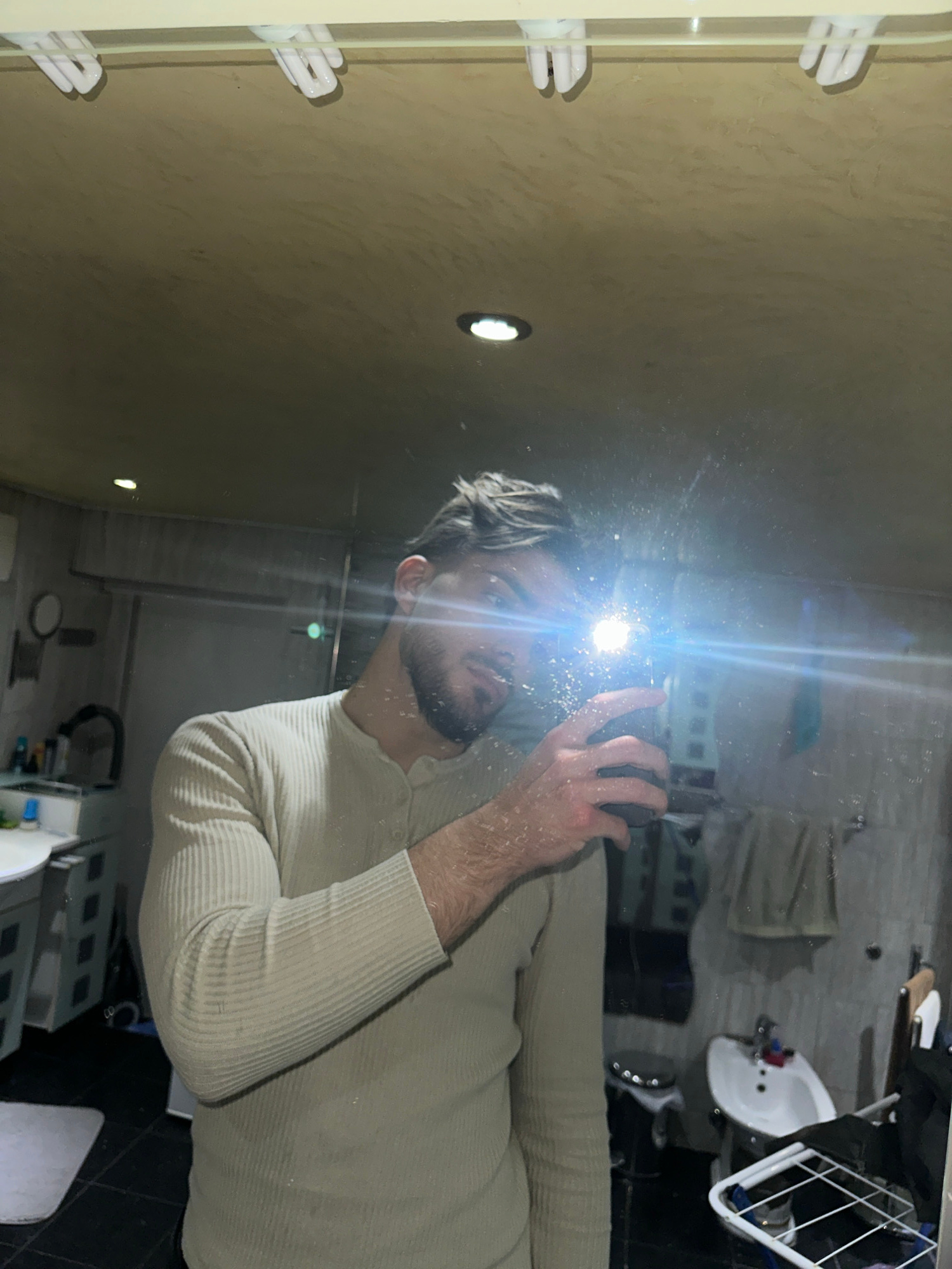A mirrored selfie shot in what appears to be a bathroom. The reflection shows a man with short, styled hair and a beard, wearing a long-sleeved shirt. The background indicates a modern bathroom settin…read more
