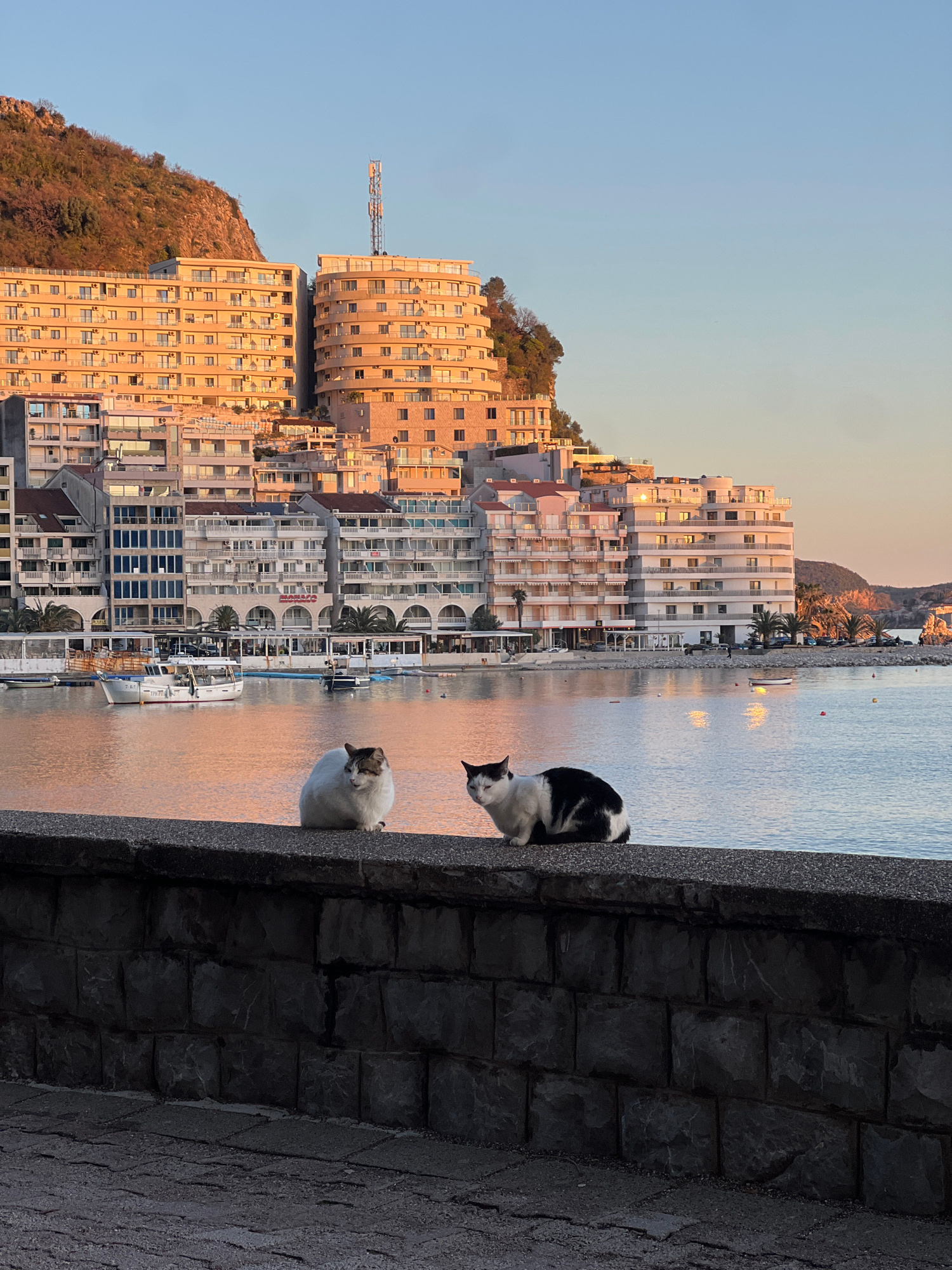 The image depicts a waterfront scene in Bečići, Montenegro, taken from an elevated position, possibly a walkway or wall. Two cats are in the foreground, resting on the edge of the wall overlooking the…read more
