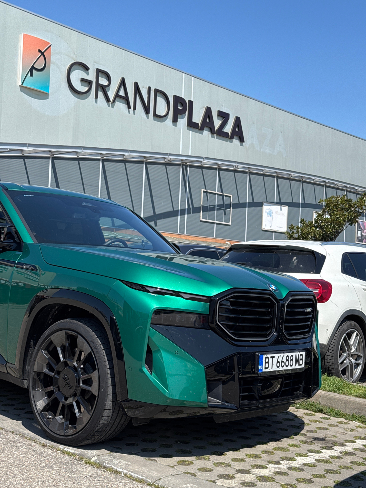 The image captures a green BMW XM parked outside Grand Plaza in Burgas, Bulgaria. The building's "GRANDPLAZA" sign is prominently displayed. A white SUV is parked behind the BMW. The car's license pla…read more