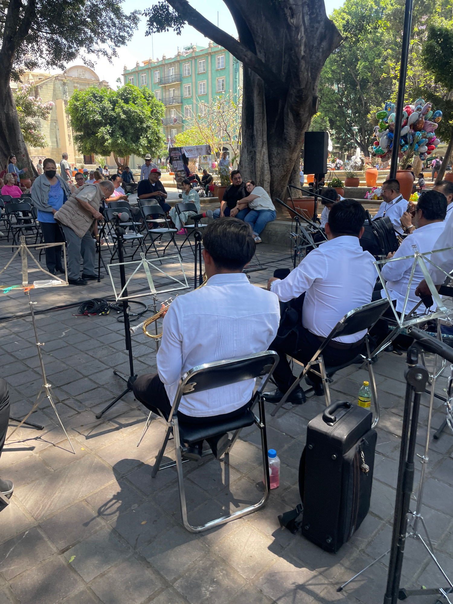 The image depicts a public performance in Oaxaca City, Mexico. Musicians in white shirts are seated with music stands in front of them. An audience is seated facing the musicians, with a tree on the l…read more