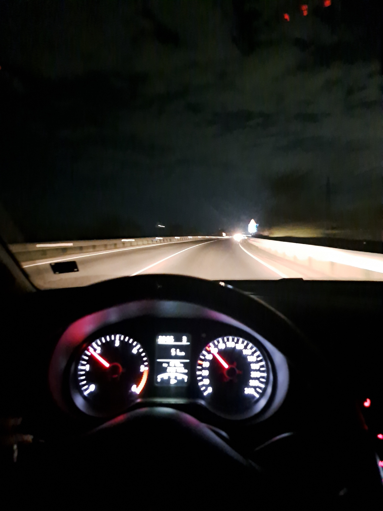 The image depicts the view from inside a vehicle traveling through a tunnel. The vehicle's dashboard is visible on the right side of the frame, showing illuminated gauges. The illuminated tunnel walls…read more