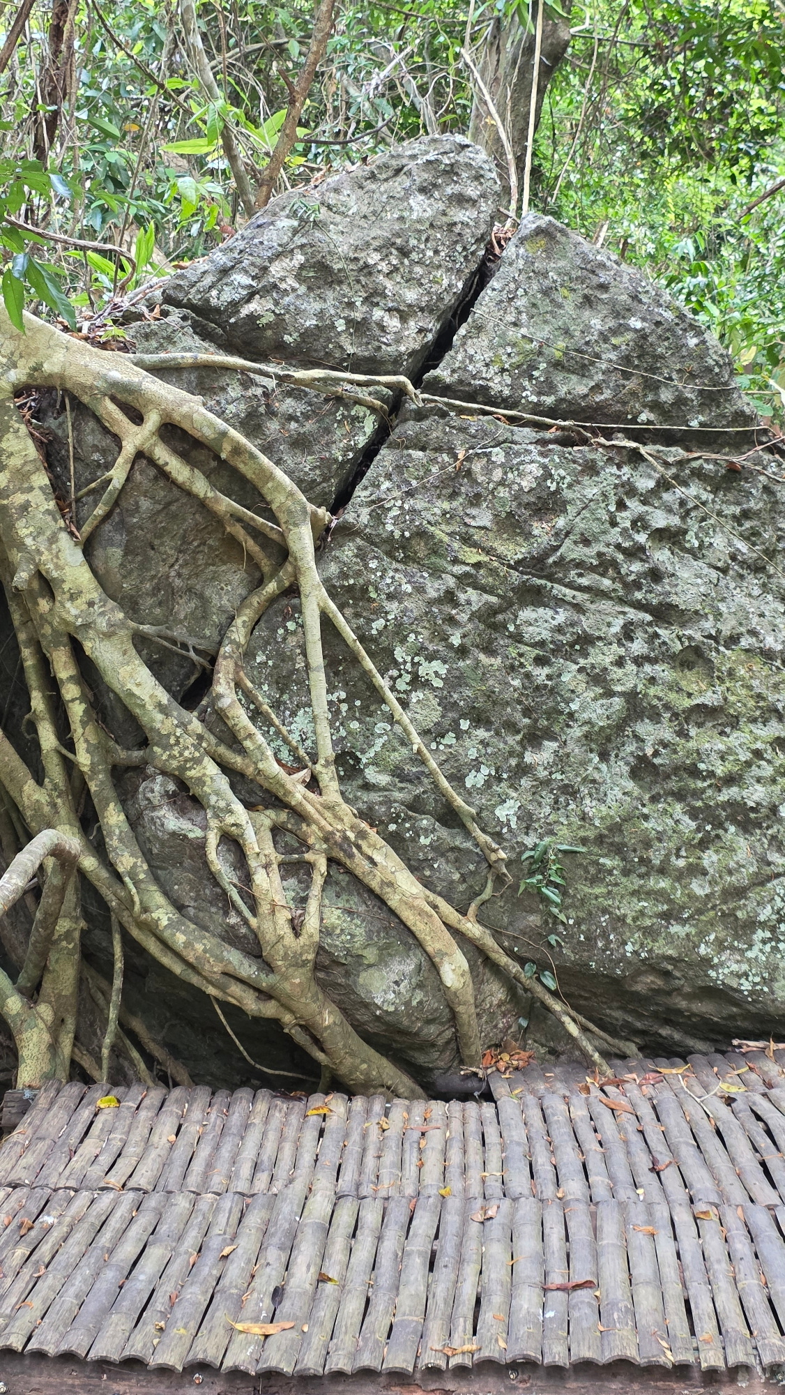 The image captures a natural scene featuring a large, grey, lichen-covered boulder split by a dark, deep fissure. Tree roots are entwined around the lower portion of the rock, while green foliage is v…read more