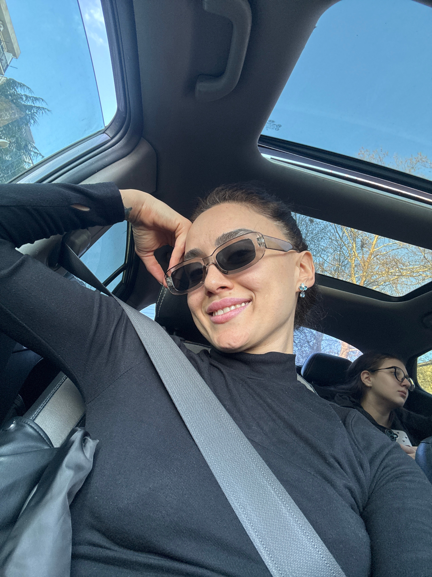 The image depicts a selfie taken from the front passenger seat of a vehicle during daylight hours. A woman, estimated to be in her late 20s to early 30s, is the primary subject. She has dark hair pull…read more