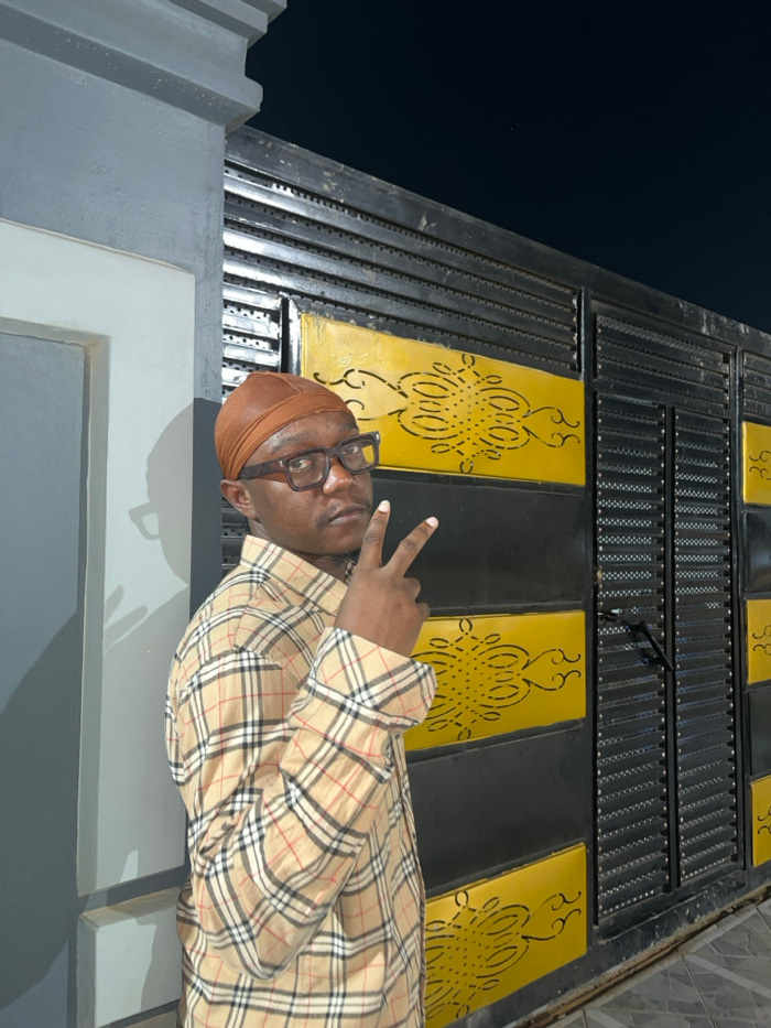A person wearing glasses and a plaid shirt is posing. The person has a tan head covering and is making a peace sign with their hand. The person is standing in front of a black gate with decorative yel…read more