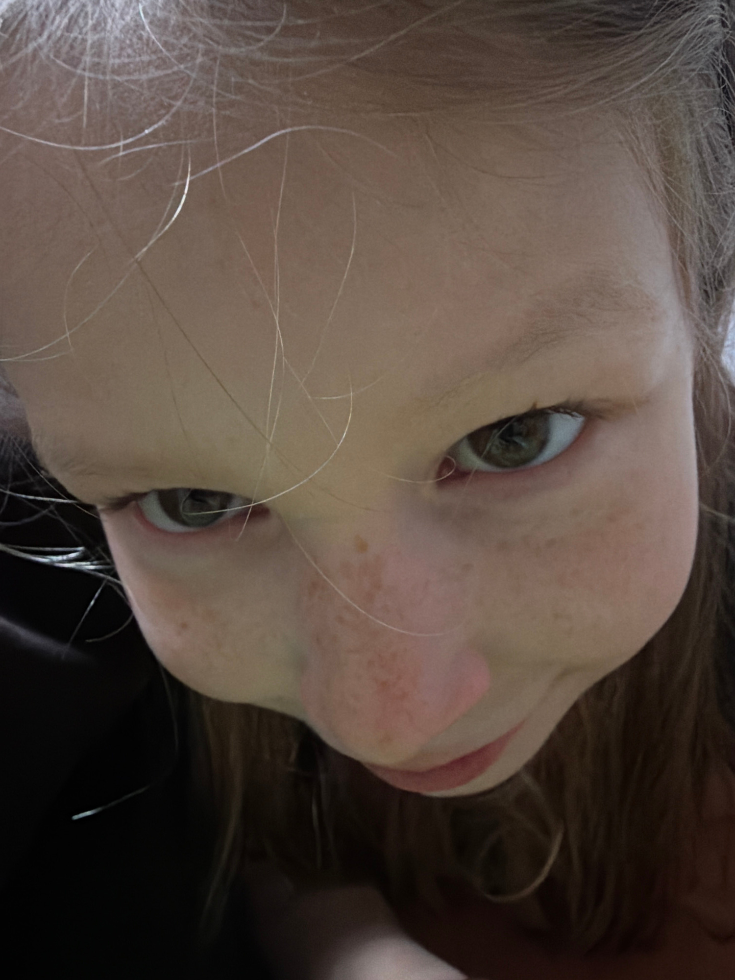 The image depicts the face of a young child with light skin and brown hair. The child has brown eyes and freckles on their nose and cheeks. The background is dark and out of focus. The location is not…read more