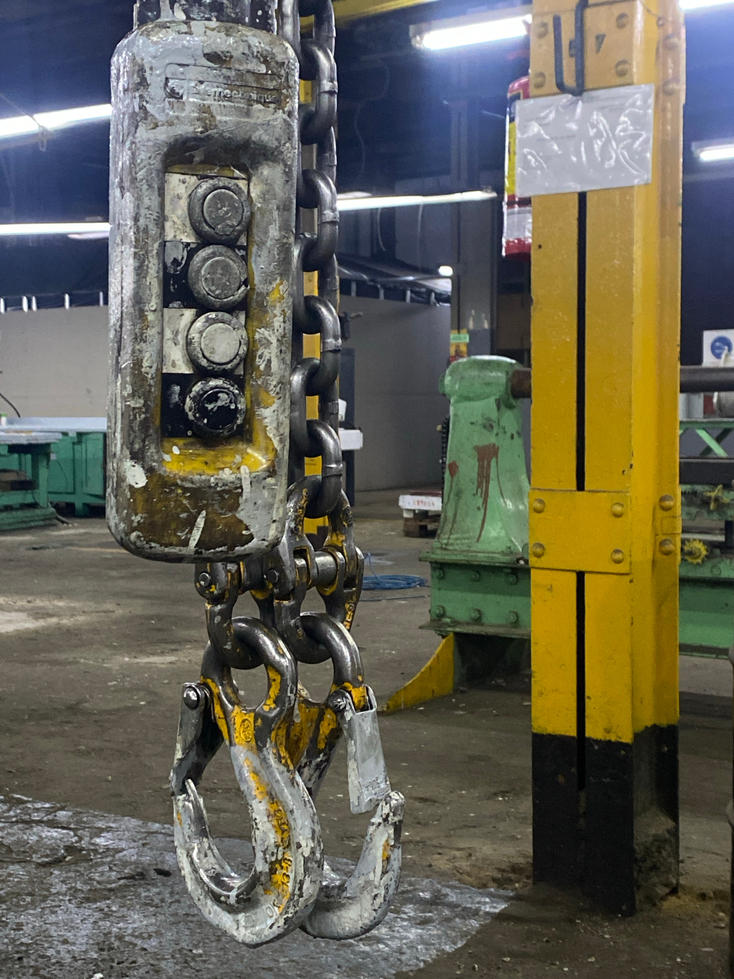 The image shows an industrial chain hoist hanging from a yellow and black overhead crane. The hoist's control box, chain, and hook are visibly worn and dirty. The background includes parts of industriβ¦read more