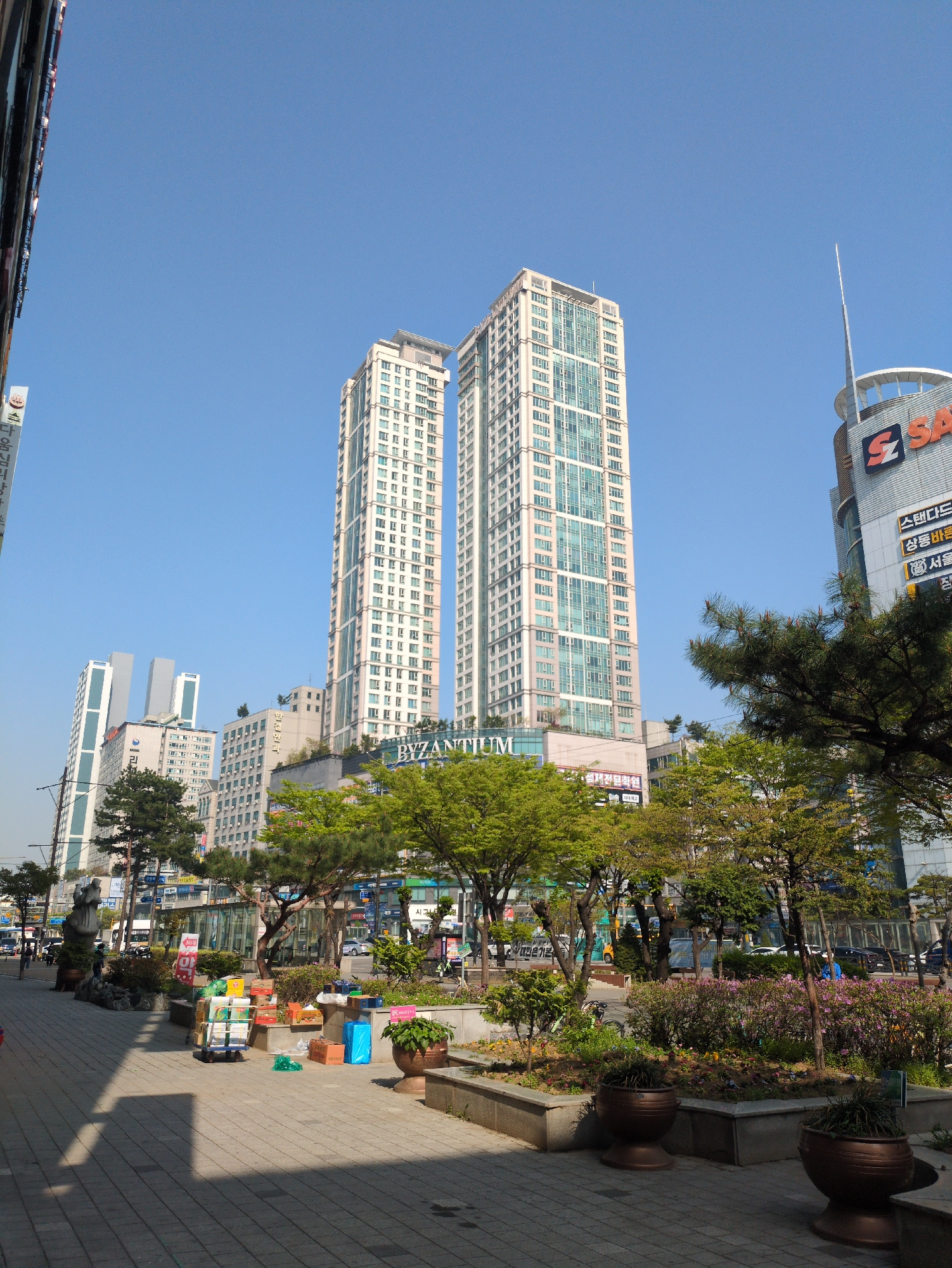 The image shows an urban scene in Bucheon-si, South Korea. Two high-rise apartment buildings with light blue windows dominate the view under a clear blue sky. A tree obscures the top of the building o…read more