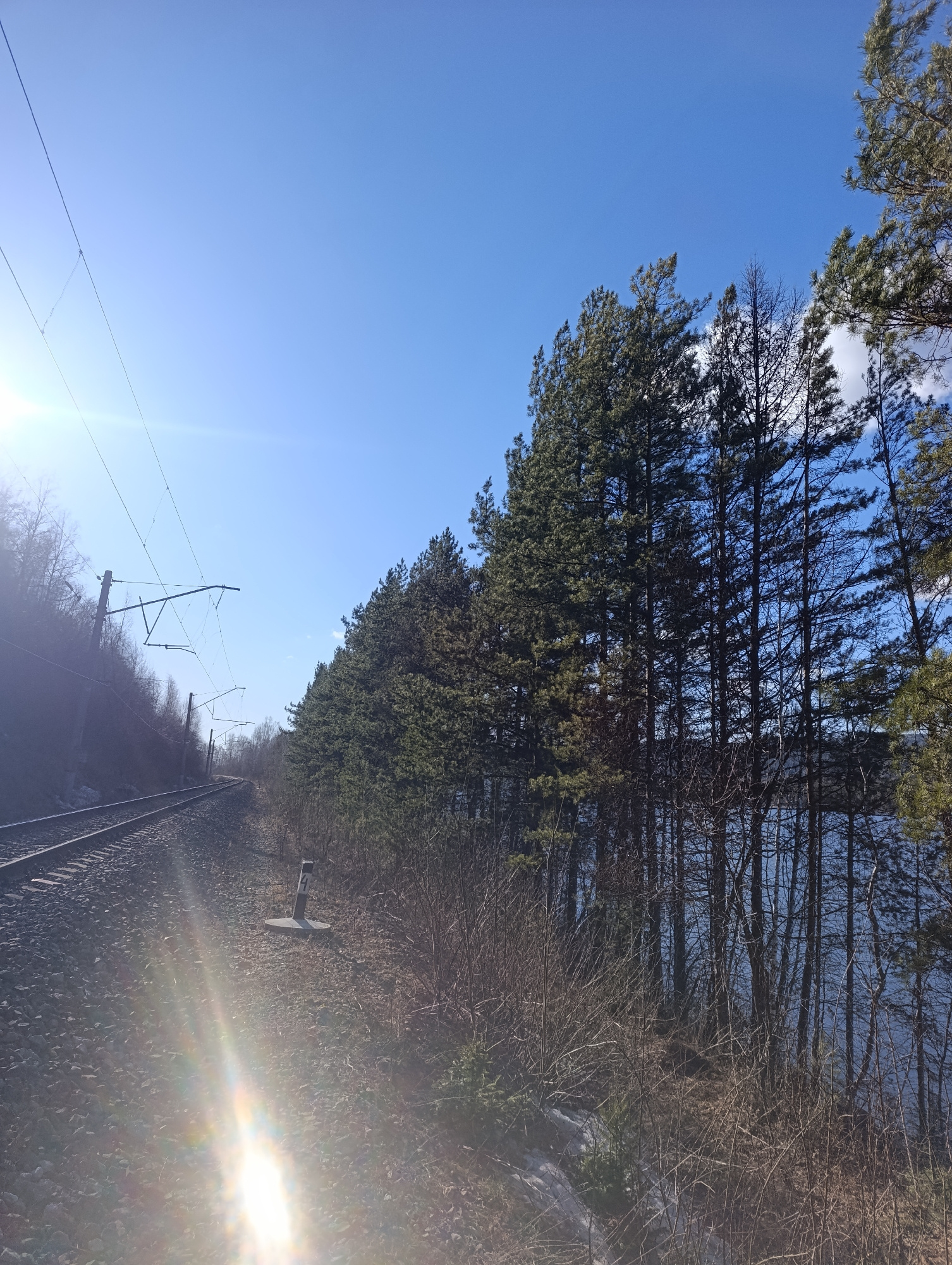 The image depicts a section of railway track running alongside a body of water, likely a river or lake, under a clear, bright sky. The railway track is on the left, with associated overhead electrical…read more