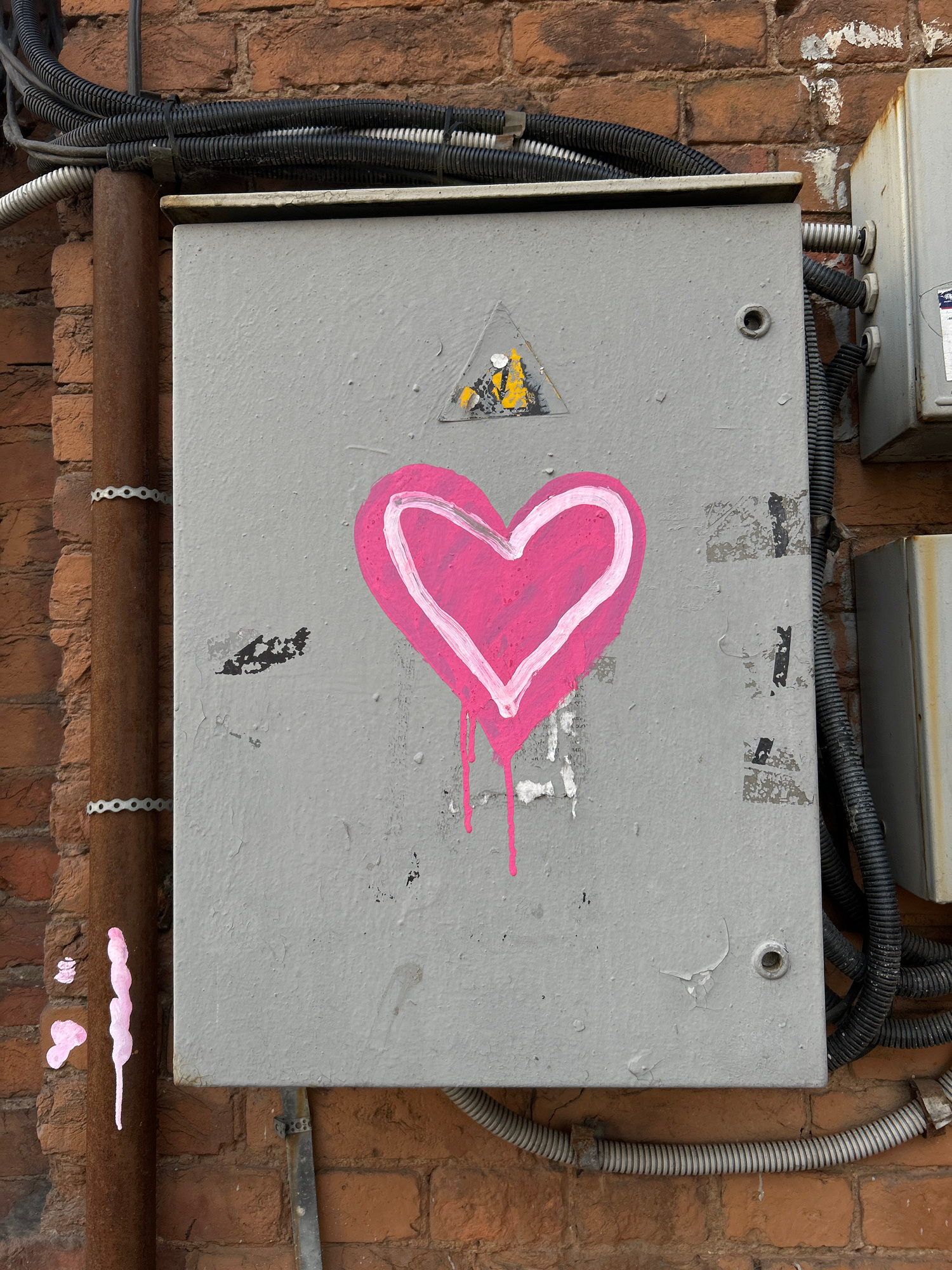 An outdoor, eye-level shot captures a grey electrical utility box mounted on a weathered red brick wall. The primary subject is a large, spray-painted pink heart with a white outline, positioned centr…read more