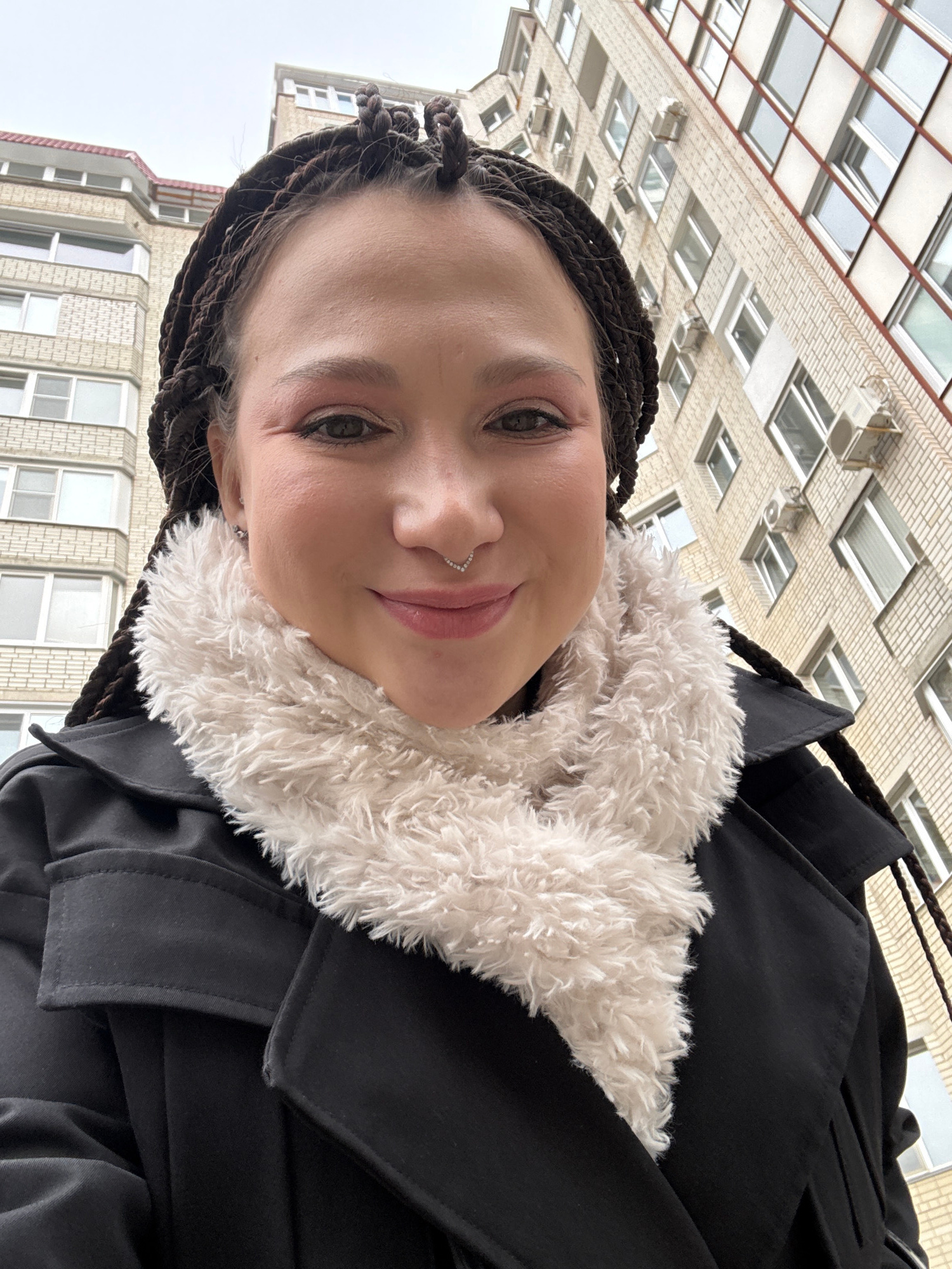 The image presents a head-and-shoulders portrait of a female subject, positioned from a low-angle perspective against a multi-story building in Saratov, Russia. The subject is centered, facing directlβ¦read more