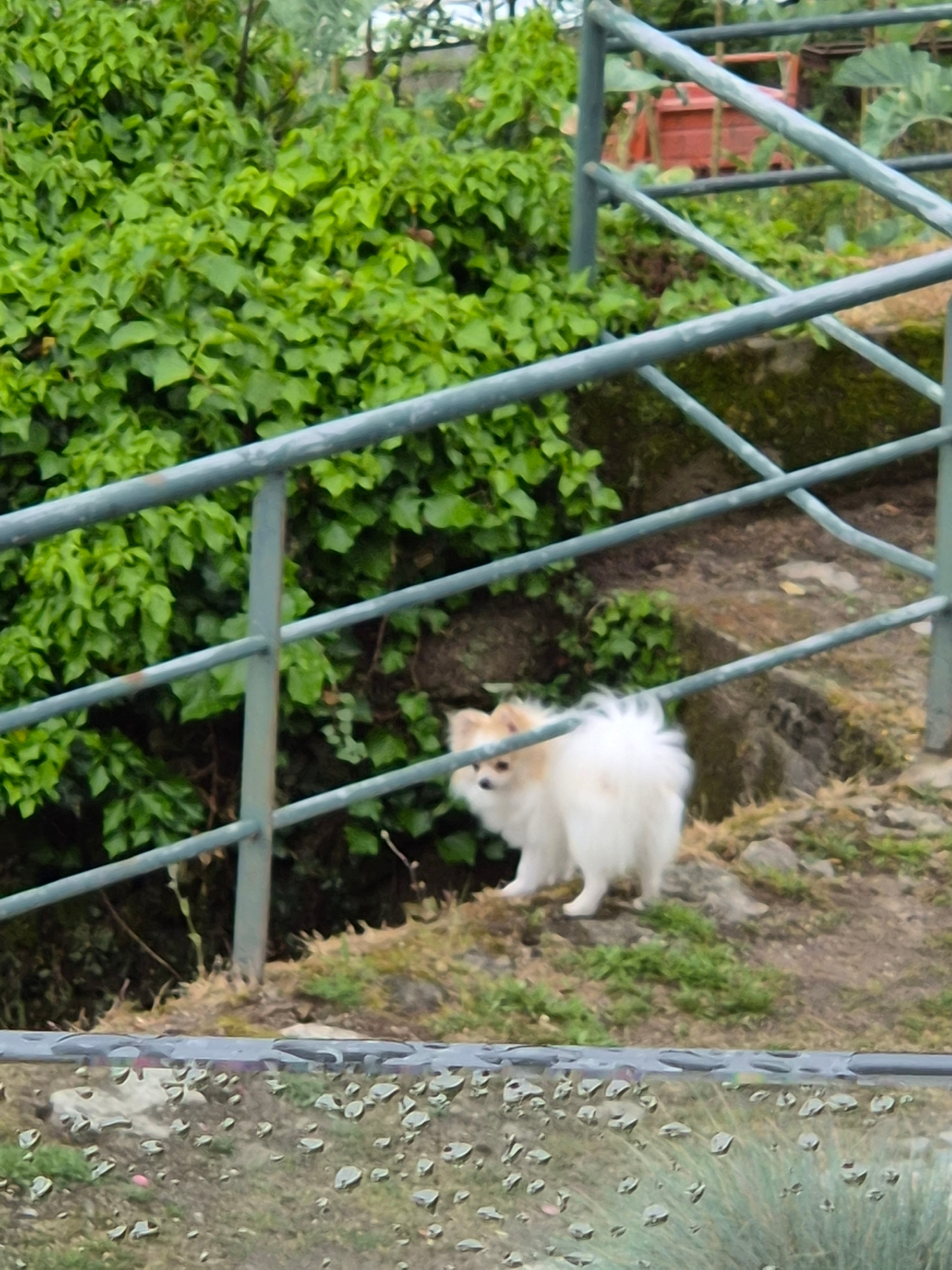 A medium shot through a blue metal gate reveals a small, fluffy, white and tan dog on a grassy slope near a retaining wall. The setting appears to be in Barcelos, Portugal, suggested by the regional f…read more