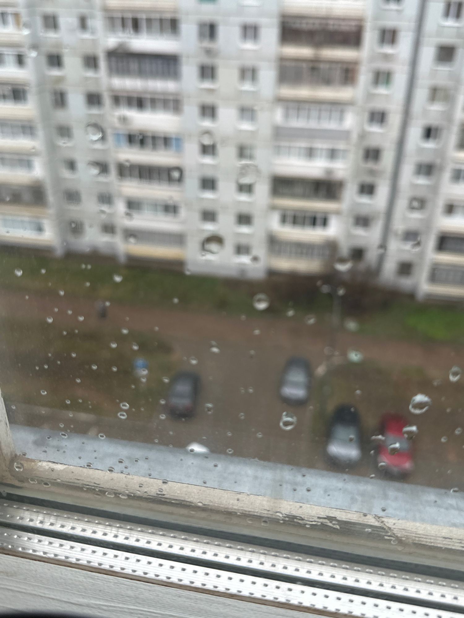 The image captures an overhead view from a building in Chaikovsky, Russia, looking down through a rain-splattered window. The immediate foreground is heavily covered with water droplets of varying siz…read more