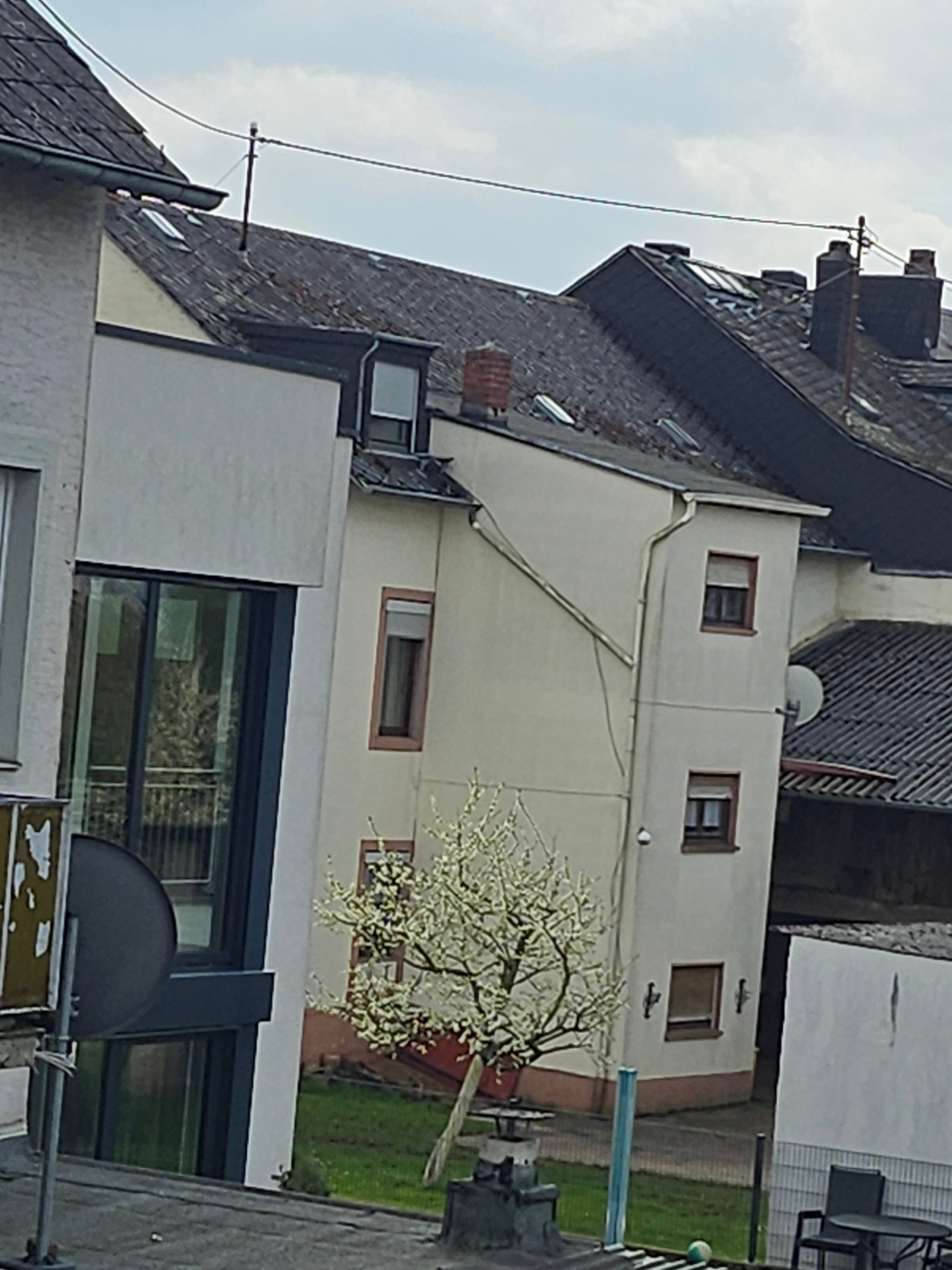 The image shows an urban scene, possibly in the city of Trier, Germany. A building with a dark, slate-tiled roof dominates the upper left portion of the image. A light-colored building is adjacent, fe…read more