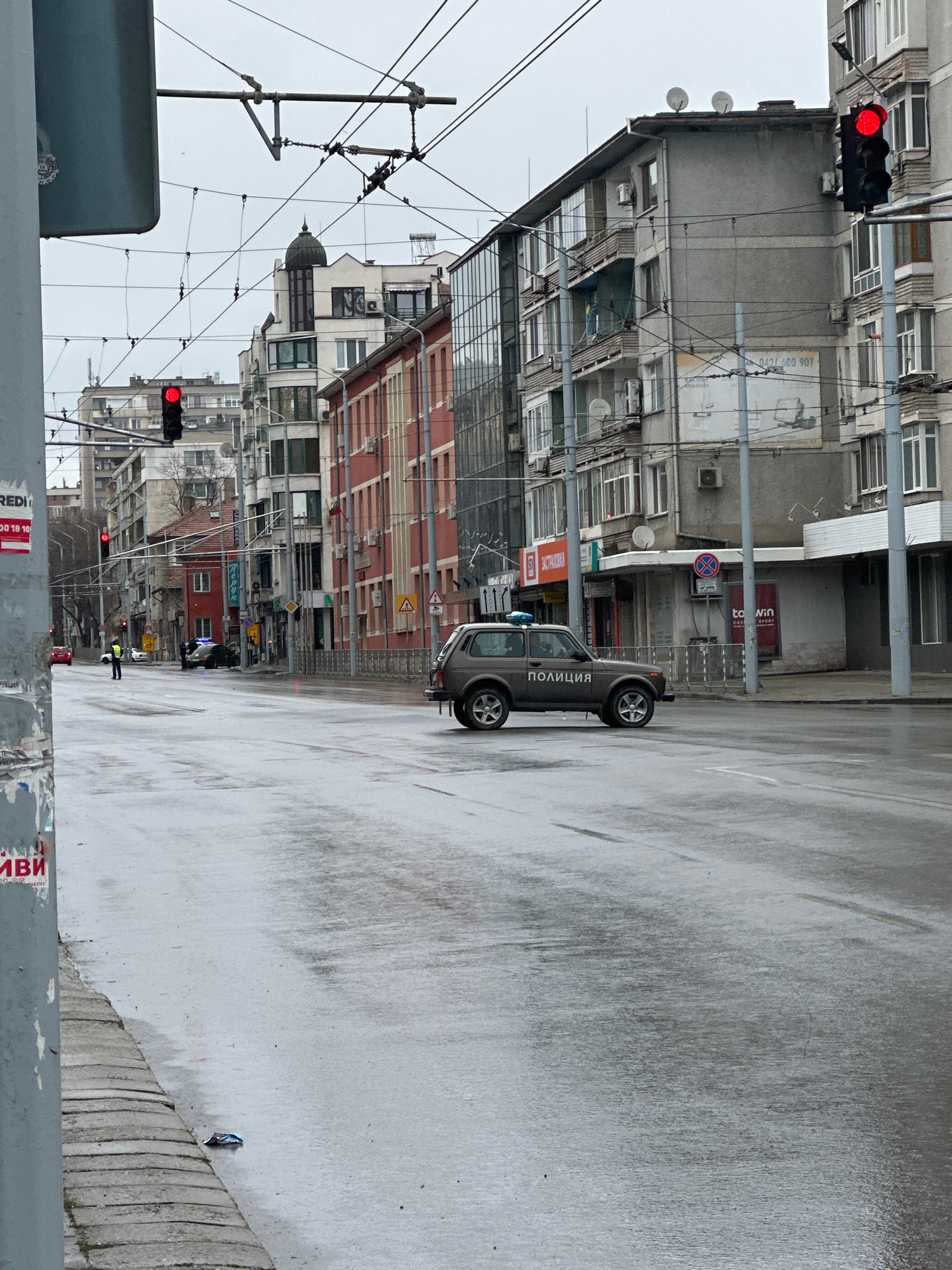 The image shows a rainy urban street scene in Stara Zagora, Bulgaria. The street is wet and reflects the sky. On the right side of the street, there is a sidewalk with concrete curb, where discarded p…read more