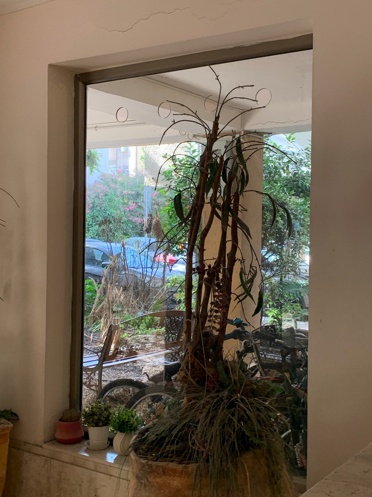 The image depicts an interior view through a window, looking out onto a courtyard. The window frame is light-colored and rectangular. Outside, the view is filled with greenery - various shrubs and tr…read more